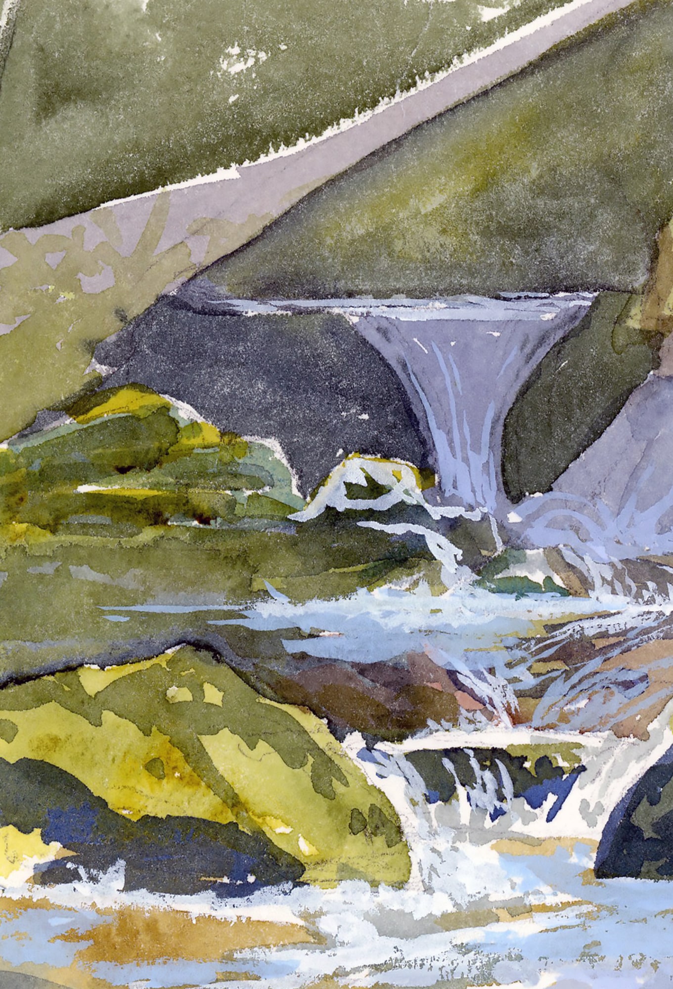 Painted live at Lamar Alexander State Forest, upper creek. There were fishermen all around me, literally pulling trout out of the stream. Sometimes the shapes are as mesmerizing as the sound of the water! Watercolor, gouache, Arches paper, about 8" X 10".