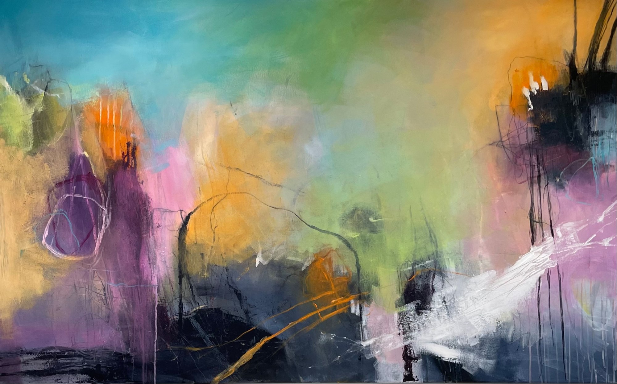 Cathy Mevik is an expressive abstract artist creating raw, intuitive paintings, exploring emotion, depth, and personal expression through layers and markmaking.