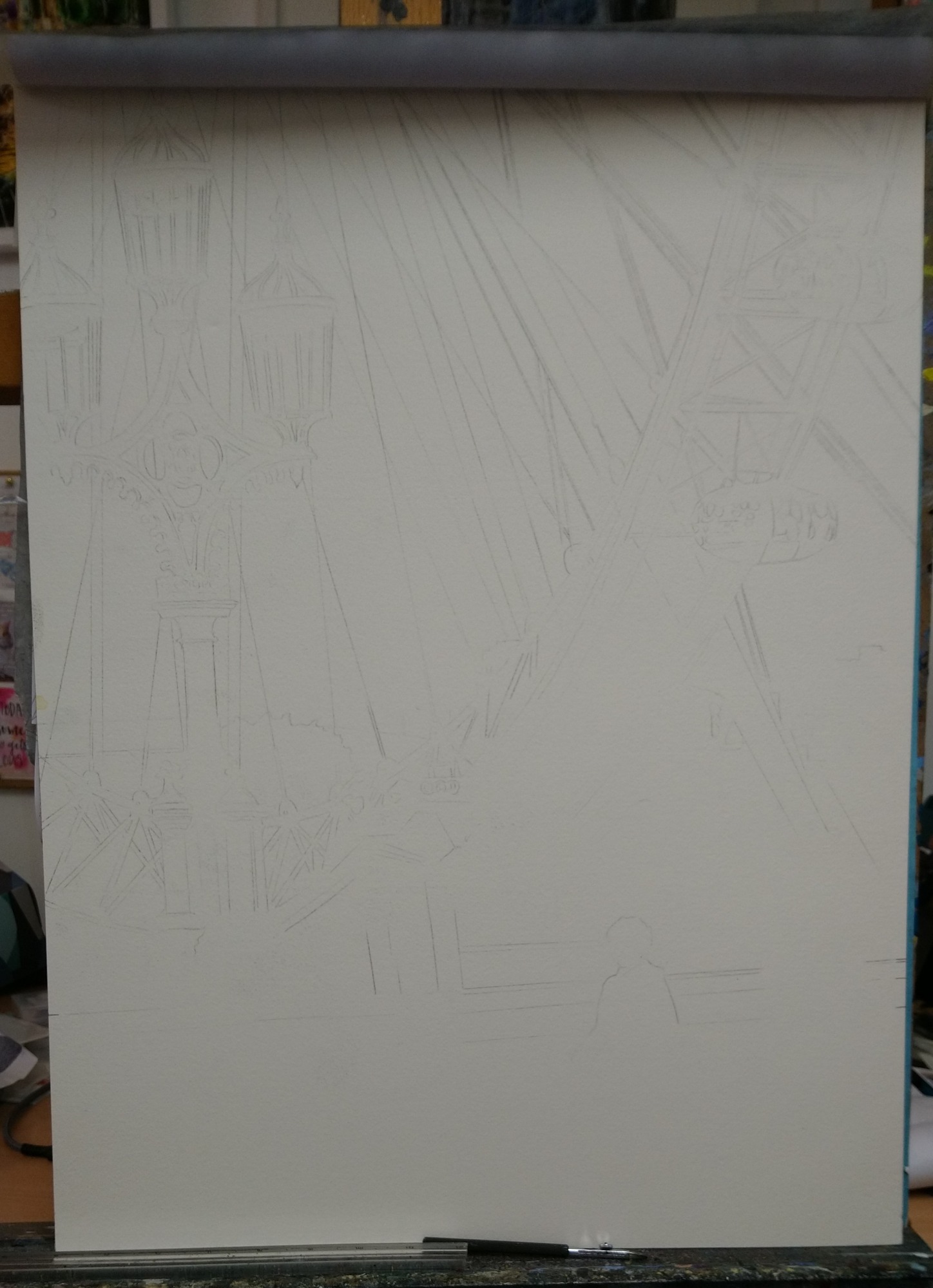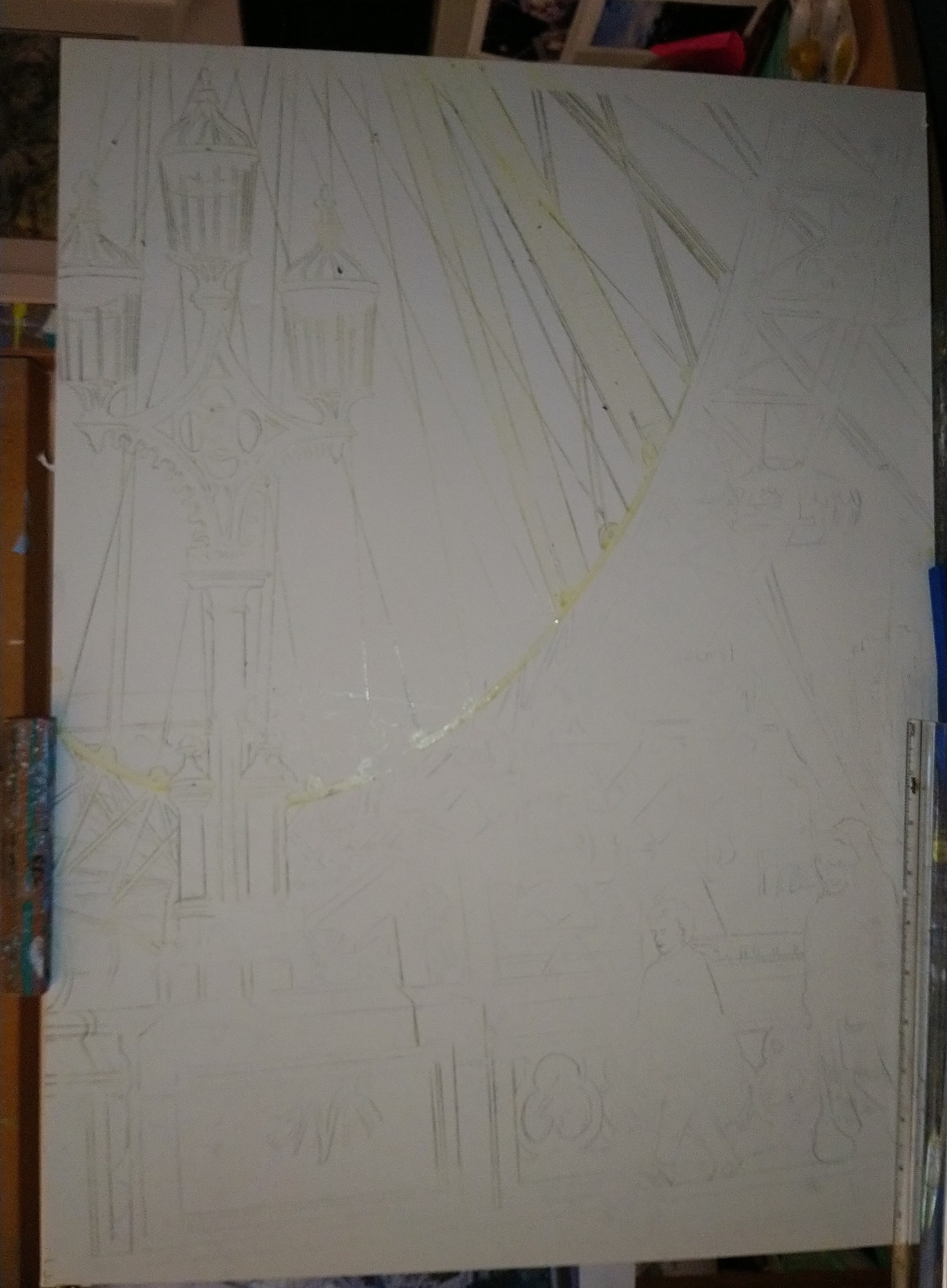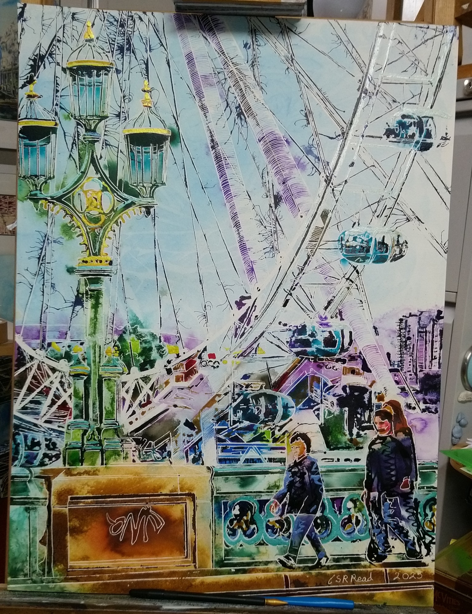 The four clubs are on the railing or wall of the bridge behind the three solid figures, with a determined appearance. Oblivious to the beauty of the surrounding scene. The lamp post draws your attention, set at the heart of a Ferris Wheel halo. Three gemstones set in gold with all the details that you could imagine. Over the top comes to mind. More Victorian excess they didn’t do lights. They did lights with knobs on literally. I wonder if that’s where the phrase originates, I must go and find out.