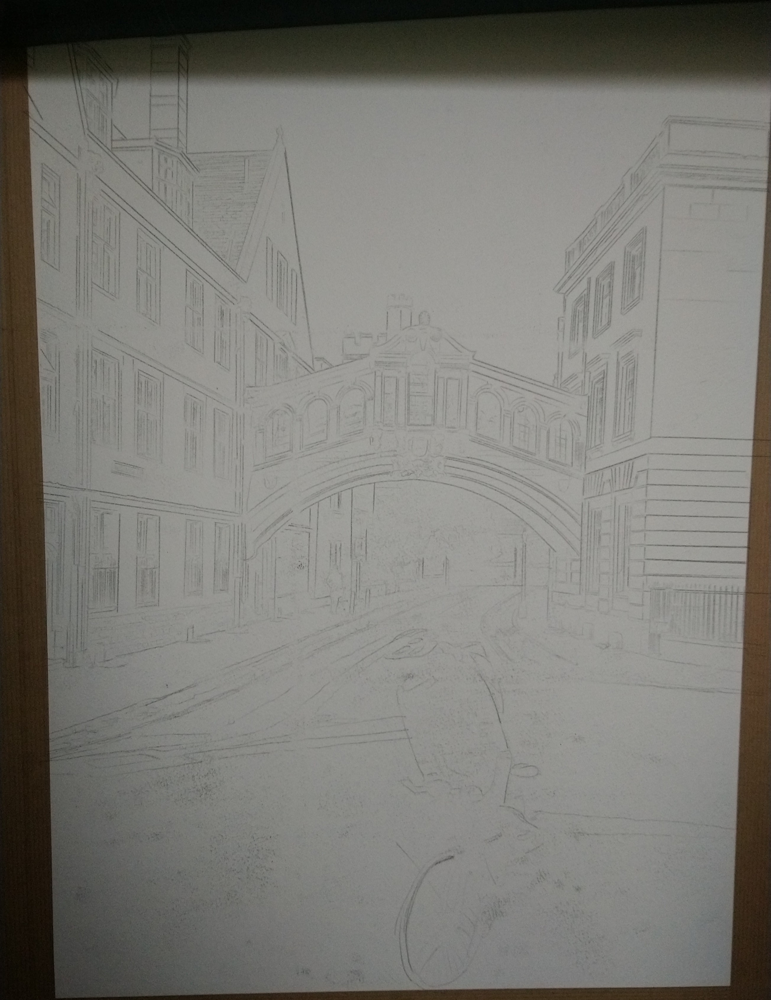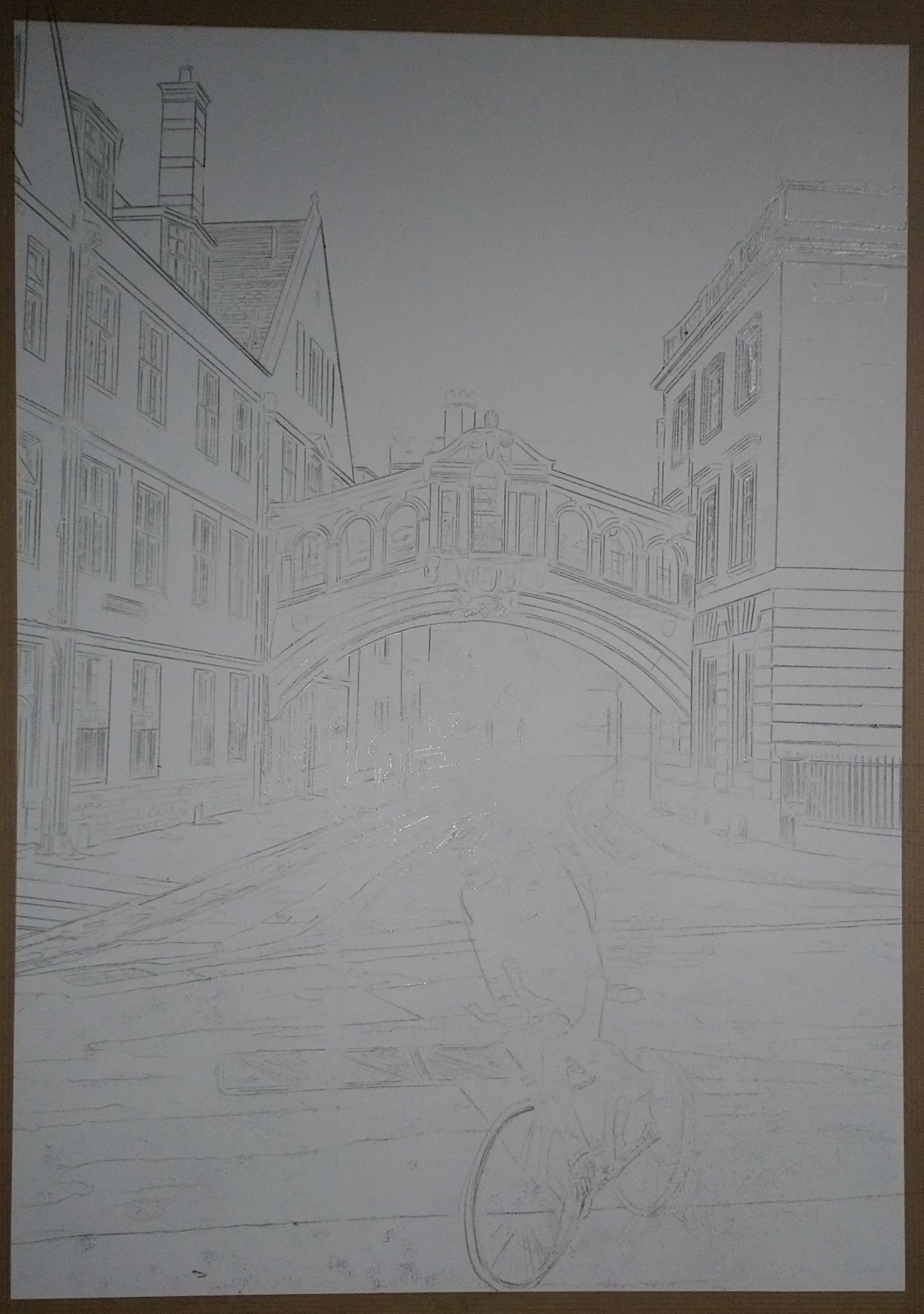 The road surface dominates this image. It is a scarred surface telling of roadworks, resurfacing, and general wear and tear. Yet the road surface, like the bridge, is a recent construction when compared with Hertford College, steadfast in the background. The 800-year-old building looks more majestic than the care-worn roads despite hard work done over the years. As one would expect, the ravages of time wear away at the hardy architecture.