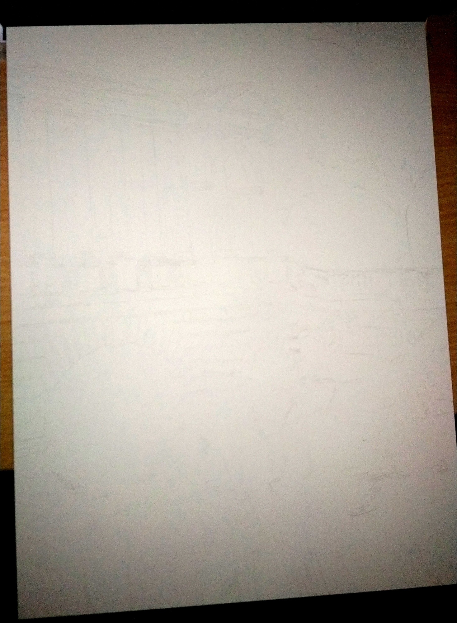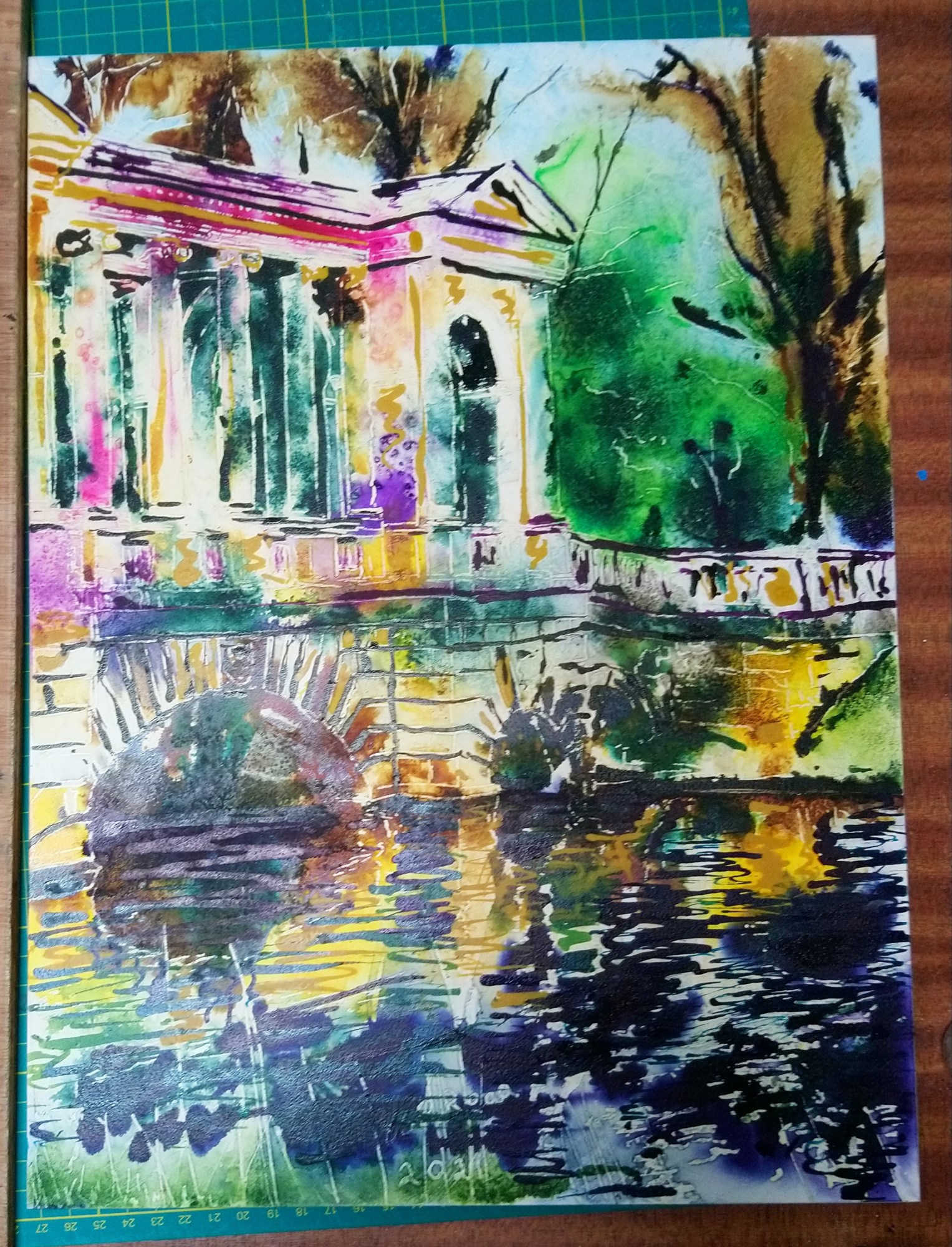 The Palladian bridge has been standing on this spot since the 18th century. Prior to that just farmland, gardens and the stream. The painting is the first I’ve created using a clay board. It’s a different experience to working on paper. I can see the appeal of fresco painting, although this is not a fresco, since the clay was dry when I painted it. The porous nature of the surface mimics watercolour paper well and feels more permanent.