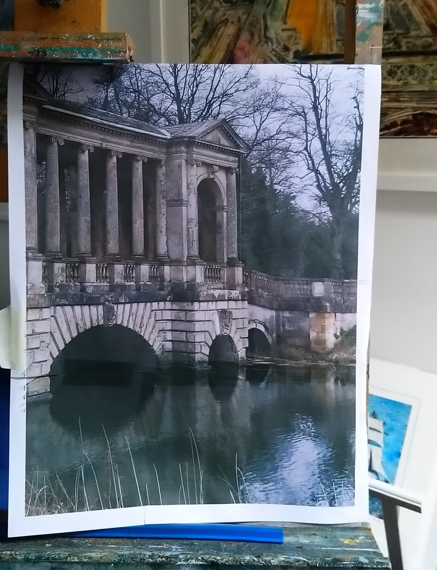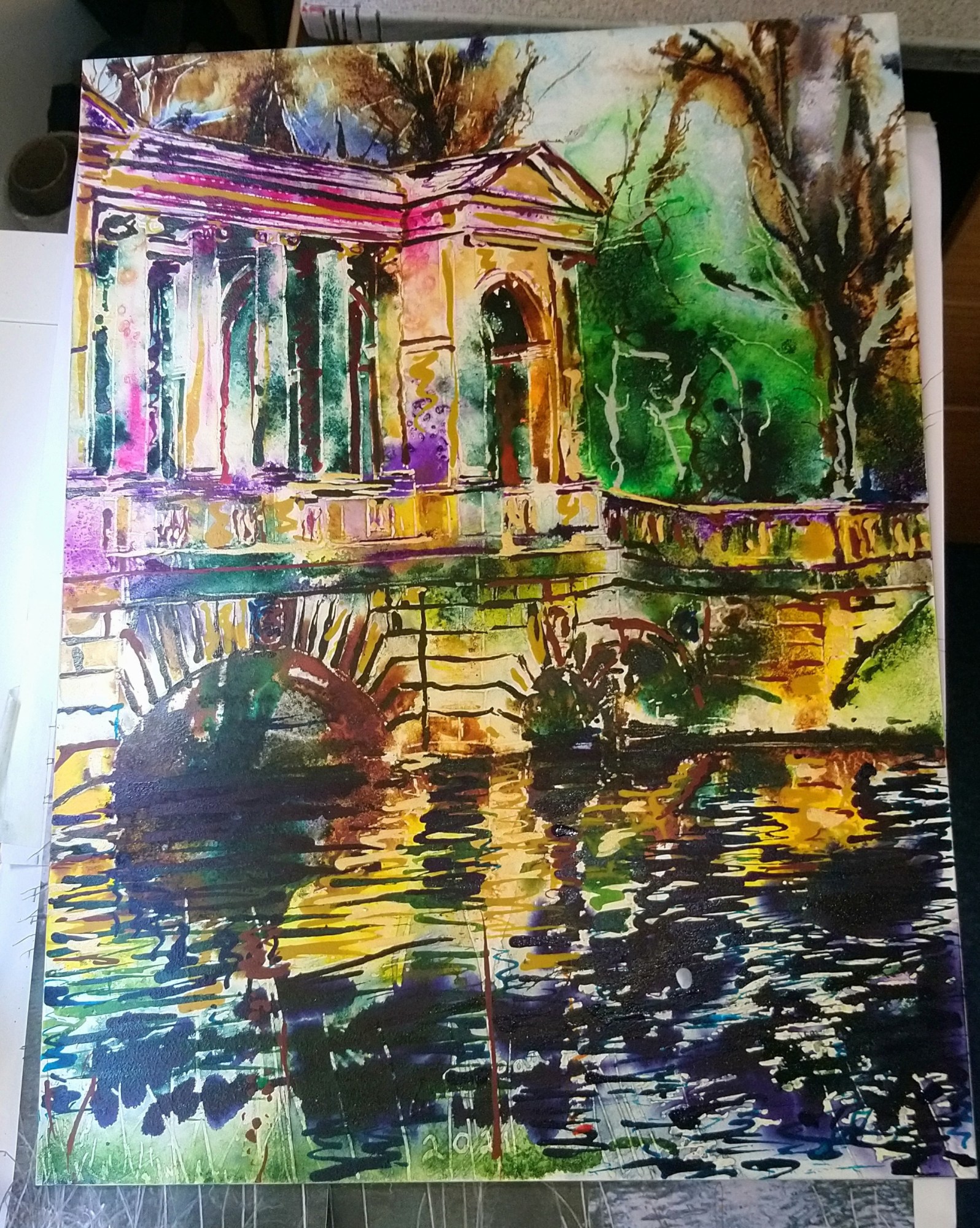 The Palladian bridge has been standing on this spot since the 18th century. Prior to that just farmland, gardens and the stream. The painting is the first I’ve created using a clay board. It’s a different experience to working on paper. I can see the appeal of fresco painting, although this is not a fresco, since the clay was dry when I painted it. The porous nature of the surface mimics watercolour paper well and feels more permanent.