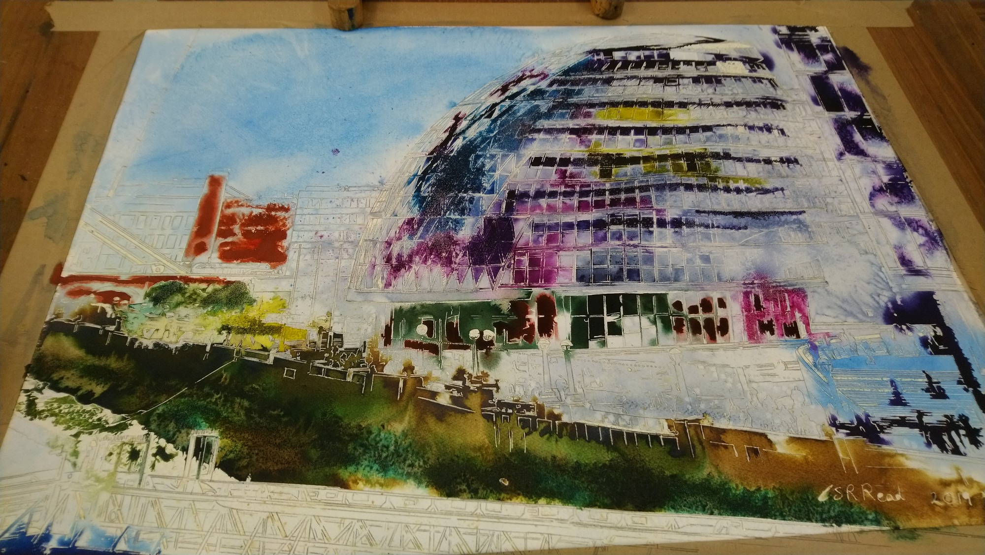 City Hall, is a curious structure. Like an alien helmet, or Eygptian one maybe, squatting in this painting of the south bank of the Thames. Set apart in a space of its own. It needs space, so that you can appreciate its outline and shape. Glorious glass, reflecting light everywhere. Jewelled colours sparkle here and there. The colours exaggerated, but present. The diamond patterns at the front, draw focus, created by the supports. The layers of Windows draw lines around the shape, leading the eye to the diamond pattern at the centre front. Here it’s on our left but the shapes leave us in no doubt, this is the centre. Like a hoard of arrows pointing to the way in.