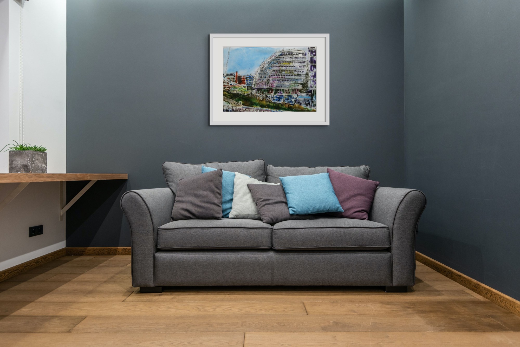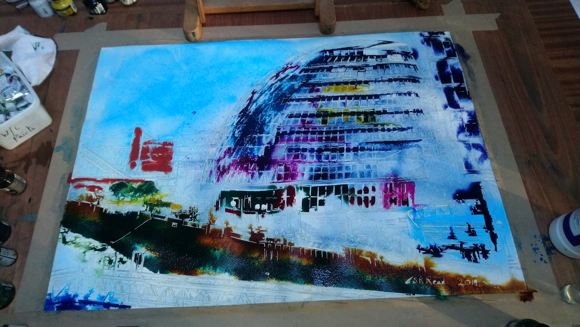 City Hall, is a curious structure. Like an alien helmet, or Eygptian one maybe, squatting in this painting of the south bank of the Thames. Set apart in a space of its own. It needs space, so that you can appreciate its outline and shape. Glorious glass, reflecting light everywhere. Jewelled colours sparkle here and there. The colours exaggerated, but present. The diamond patterns at the front, draw focus, created by the supports. The layers of Windows draw lines around the shape, leading the eye to the diamond pattern at the centre front. Here it’s on our left but the shapes leave us in no doubt, this is the centre. Like a hoard of arrows pointing to the way in.