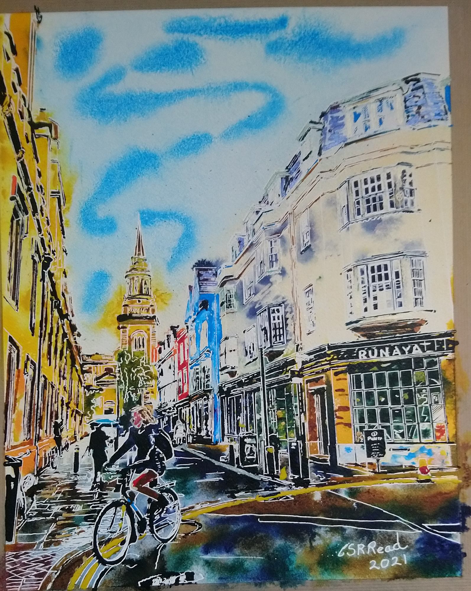 Overnight, bicycles overwhelm peaceful Oxford City. You cannot move for them! It is no wonder that the cycling rate in Oxford is triple the UK average. In term time, the three in this painting would be swamped with dozens leaning all along the left-hand wall. Sometimes as many as 5 deep – quintessentially Oxford.