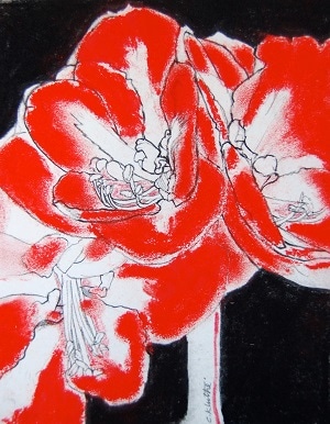 This drawing is a series of three drawings of an Amaryllis in different stages of blossom. It is drawn with charcoal and a layer of coloured chalk to the petals. The paper is archival print, non acid paper.