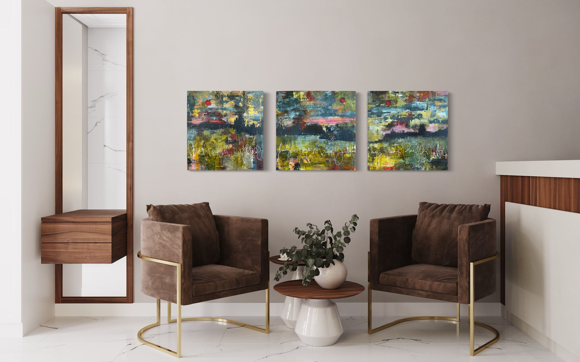 These pieces can be purchased as a grouping or individually. Please inquire. The dimensions listed are per piece. The triptych dimentions would be approximately 24x72 (not including the space between the pieces.)