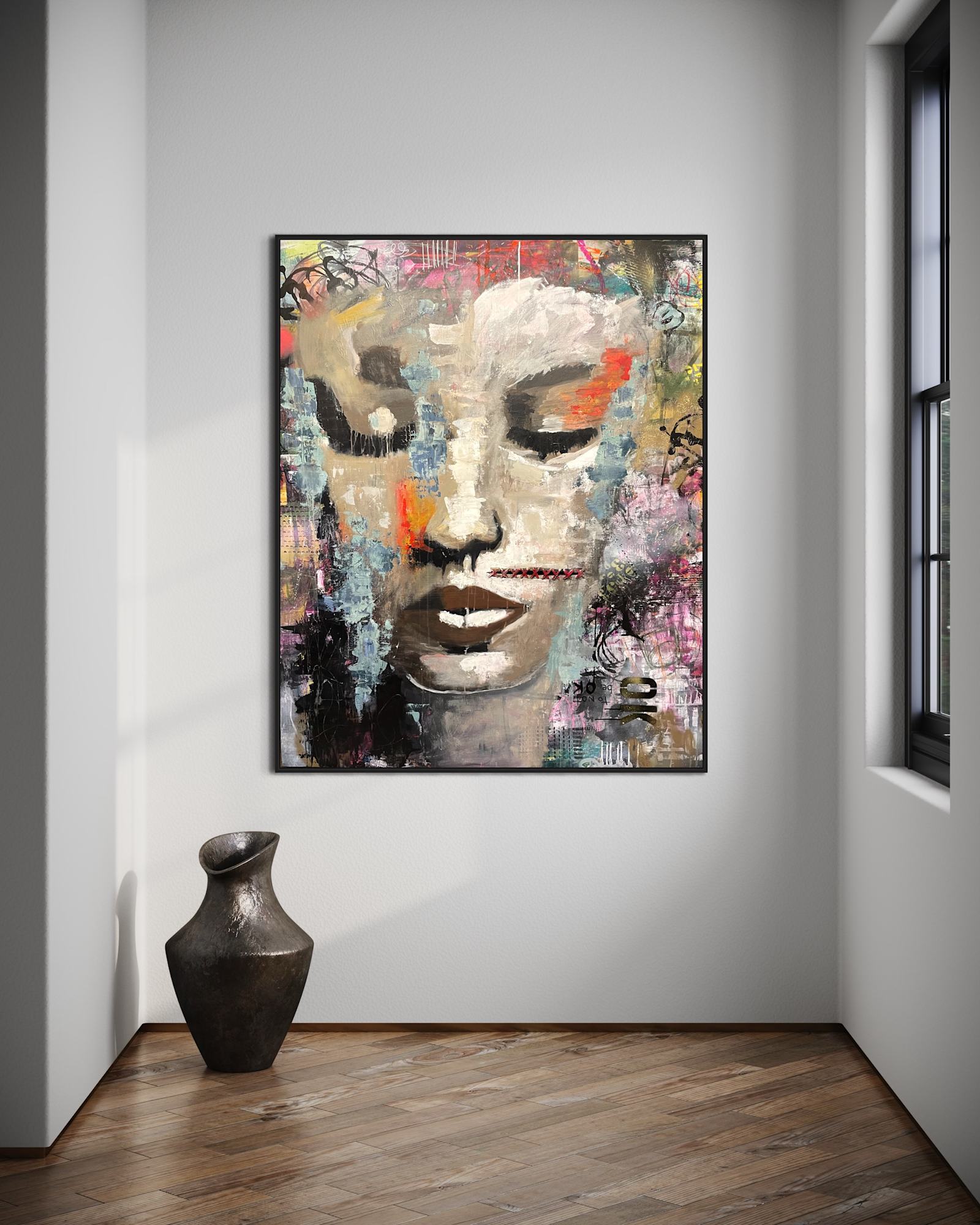 This piece was born out of many iterations...beginning with an unknown concept, to suffering a tear in the canvas, then nearly ending up in the garbage, finally transpiring into a powerful painting with a message of hope, healing and perseverance. The chaotic and textured background serves as a foundation for the image of an embattled woman that emerges with strength and dignity. A compelling and striking piece with a myriad of emotions embedded into its layers.