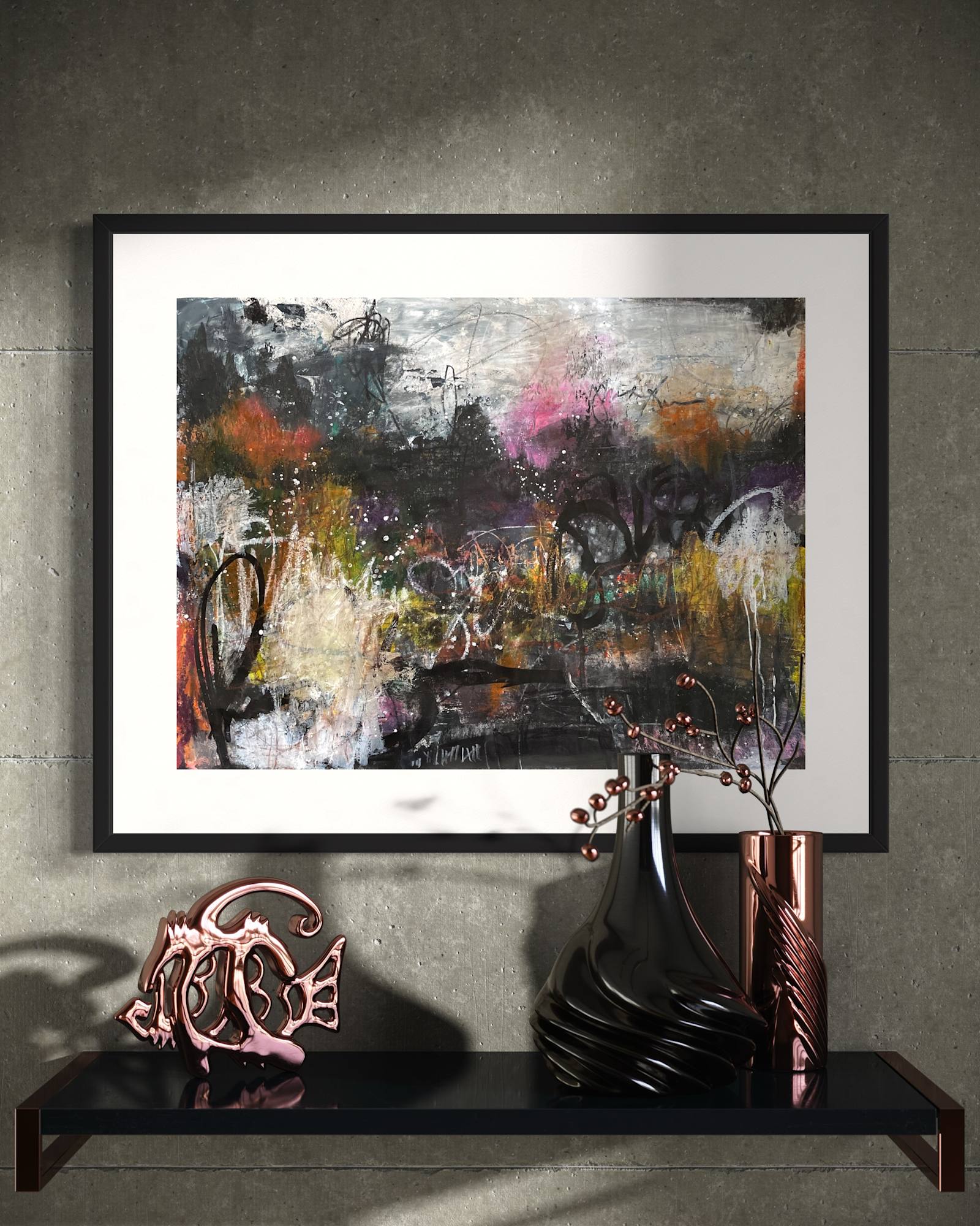 Valleys of Uncertainty reflects my moments of frustration and anger in life's challenging times. Sometimes what I paint isn't "pretty," but it represents how I am feeling. The energetic mark making and dark color palette matched my mood. Even though this piece may not be "pretty" in the obvious sense, there is a raw beauty to it. Just as we weave our challenging days into our happier ones, the tapestry that emerges is a beautiful image with the depth and contrast of our myriad emotions.