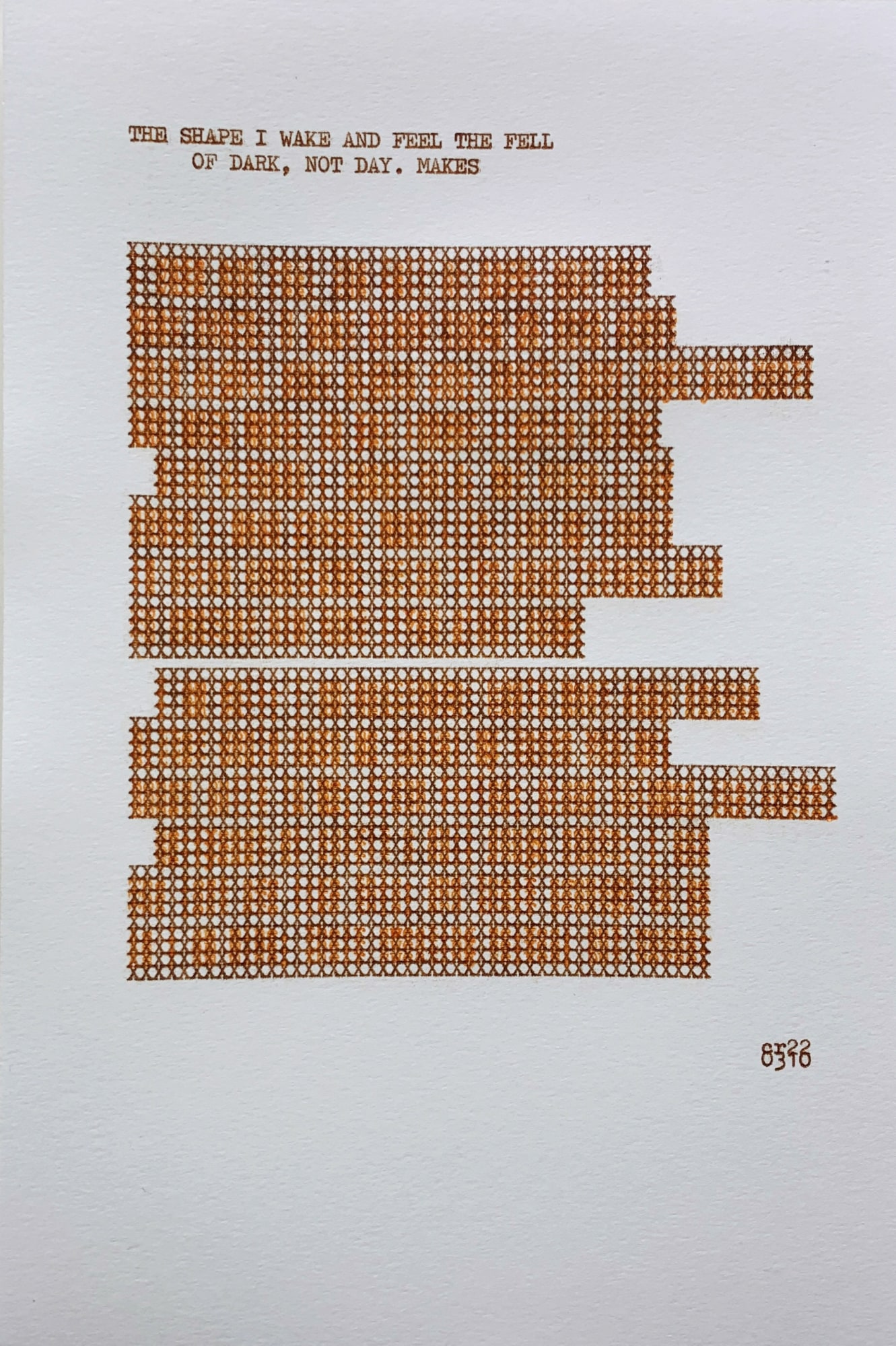 Overtyping and obscuring Gerard Manley Hopkins's "I wake and feel the fell of dark, not day" to highlight the shape it makes on the page.