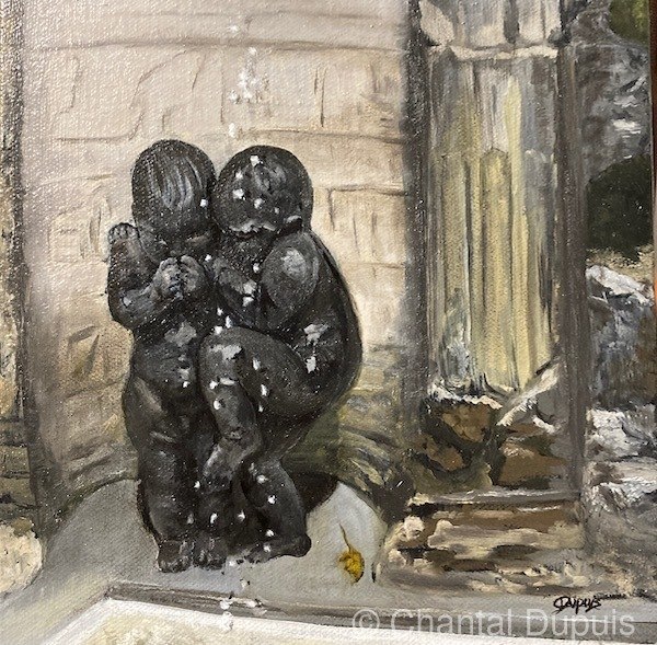 This is my plein air painting of a 1912 stone fountain called "Enfants à la Fontaine" from artists scupltorRené Bertrand-Boutè, which now resides at the Rockery Park in Ottawa. Now referred to as the Soper's Fountain, the original was awarded the "Prix de Paris" in 1912 where it was purchased by Mr Soper then, in 1960, it was donated to the National Capital Commission in Ottawa. It has been "living" in the park ever since, only 3 of the 5 original children are left. The feeling the sculptor transmitted of the 2 children seeking warmth which cold water was pouring on their heads from above translates to us even today. Being a grandmother of twin boys, this fountain really called to me and I just had to capture the boys!