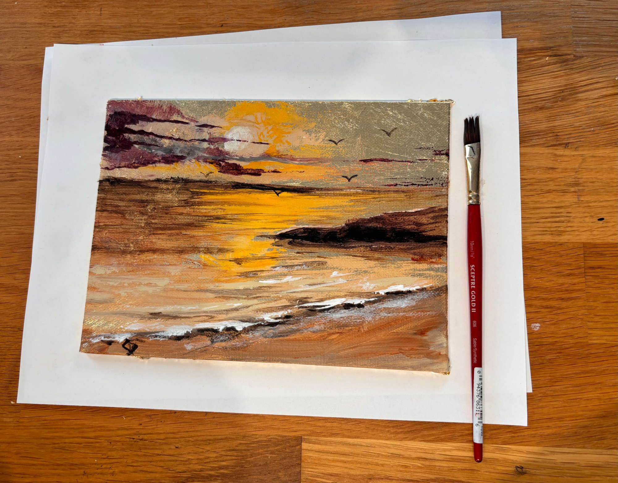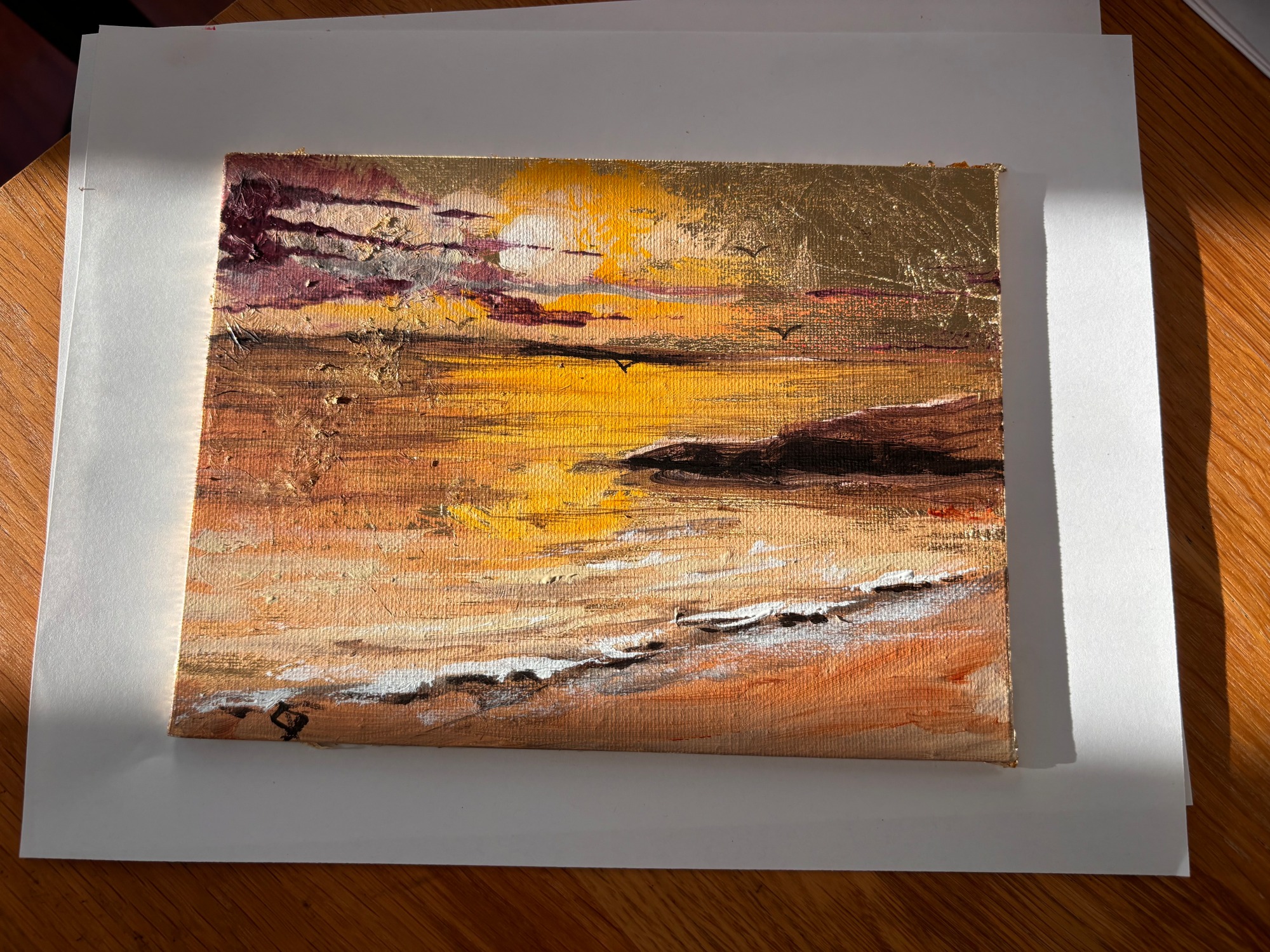 A fun experiment using metal leaf as the background then improvising a brilliant sunset and beach.