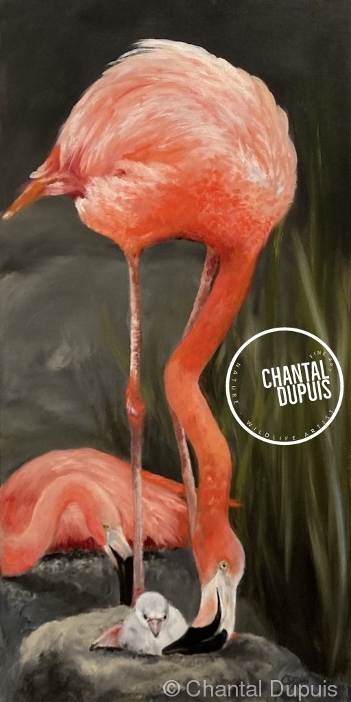 I have a fascination with flamingos lately. I love their colouring, especially when they are well fed on shrimps, but mostly their ability to move their necks around almost every way possible! Their behaviours are just as much a curiosity to me. Did you know they mate for life and that the male takes as much a part at raising the chicks as the female do! This is my interpretation of a wee part of their nesting grounds. The transformation that chick will go through is just amazing, mother nature sure does her thing well! Oil painting on cotton canvas.