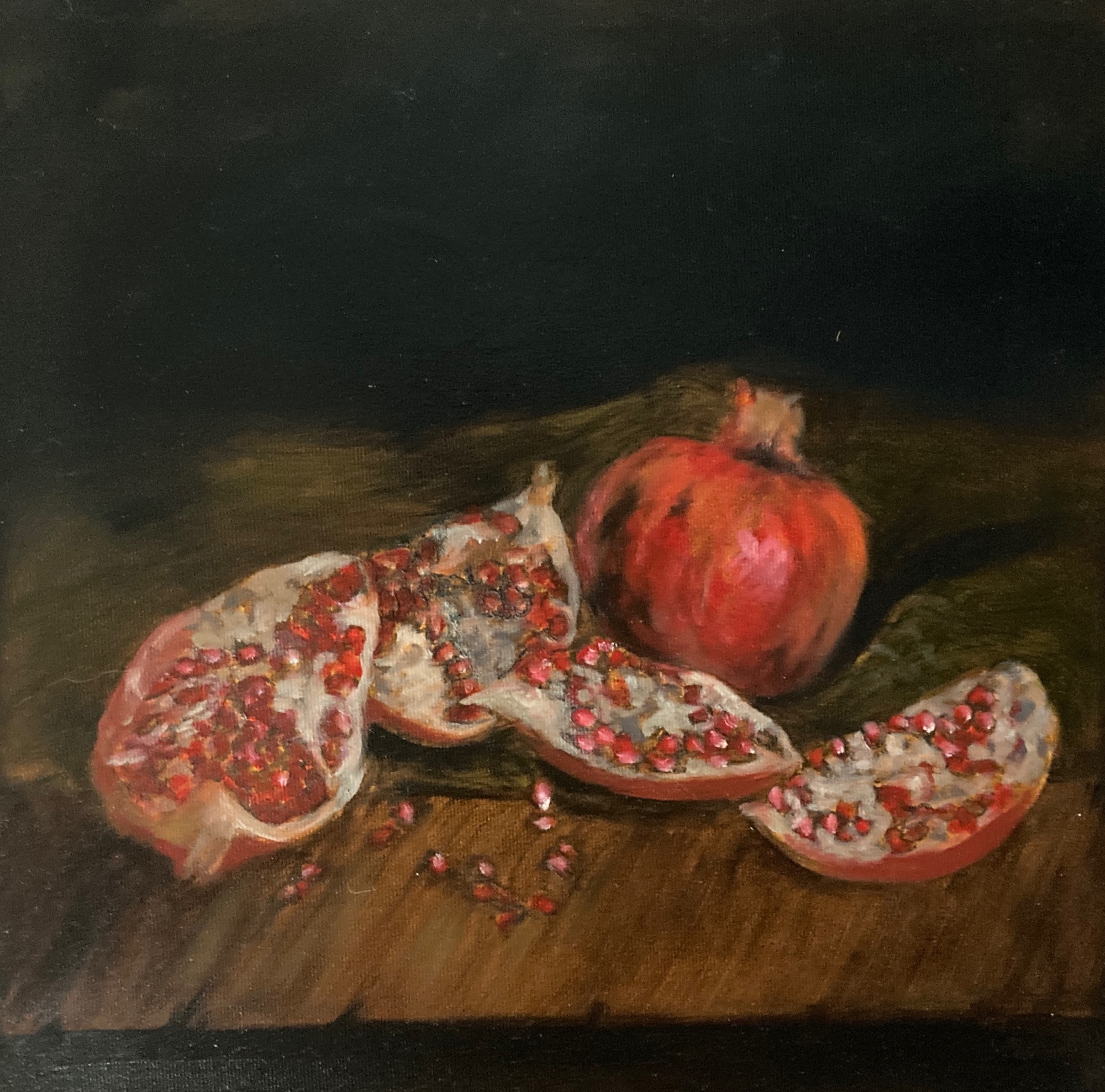 I love the feel and look of antiques. Older paintings done with very thin layering always attract me, there is something about the light that is different. This little pomegranate was done at home and represents a holiday tradition in Winter for our family, the kids always loved it when I brought the first one over from the grocery store and now we get to do the same with the grandkids! In ancient greek mythology this fruit was associated with fertility, I don't know if it is true but I sure appreciate my grand-children and the ability to be able to continue with family traditions.