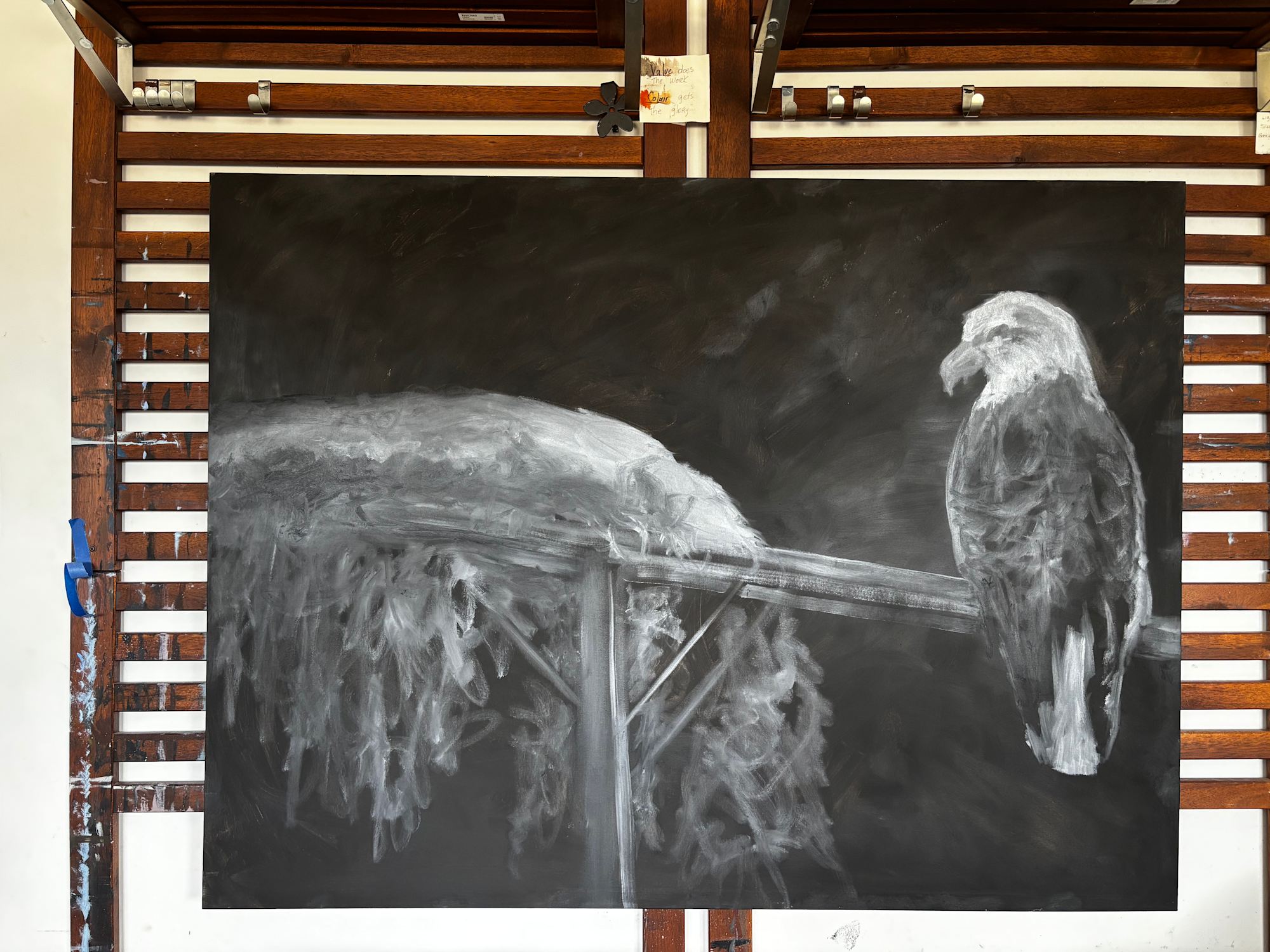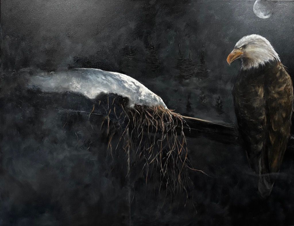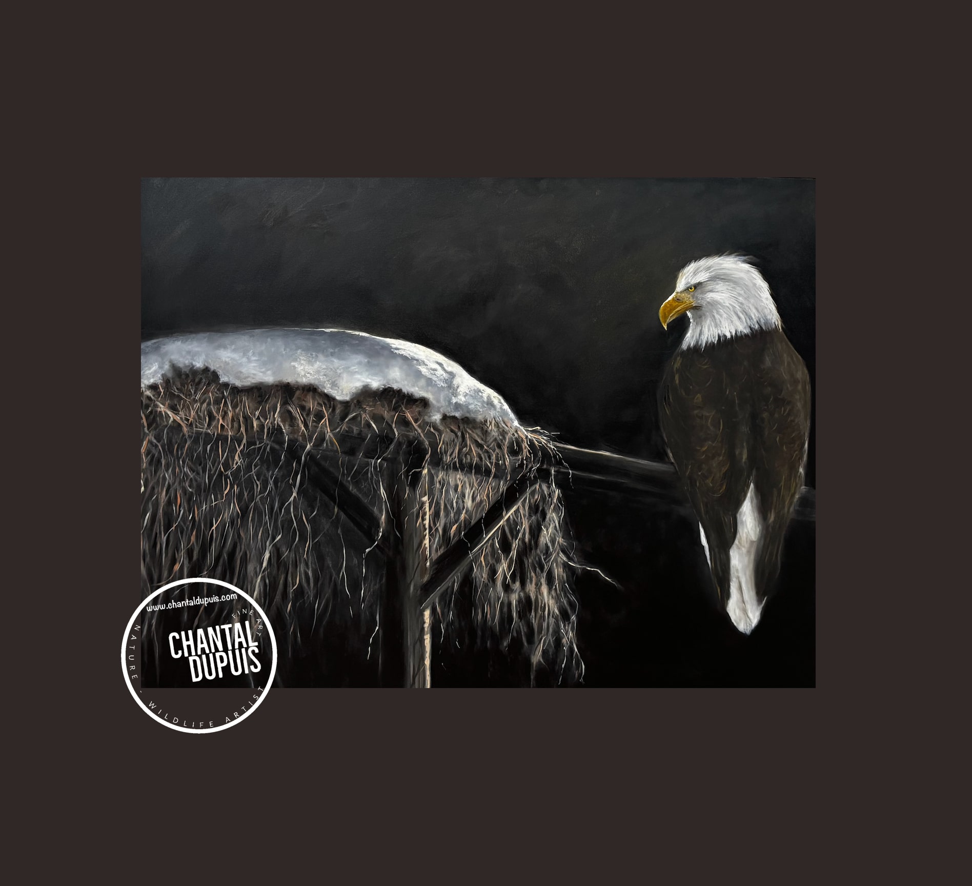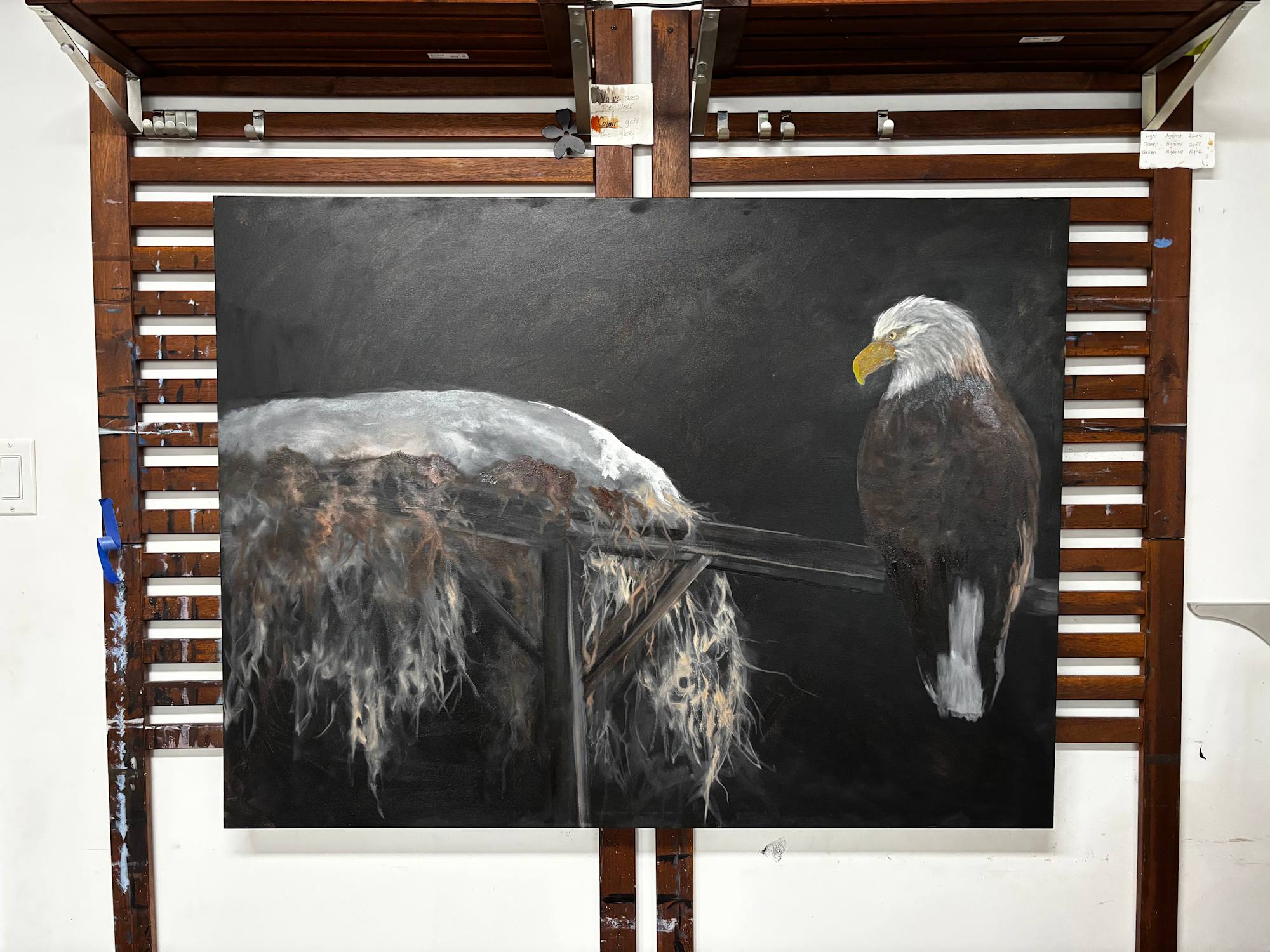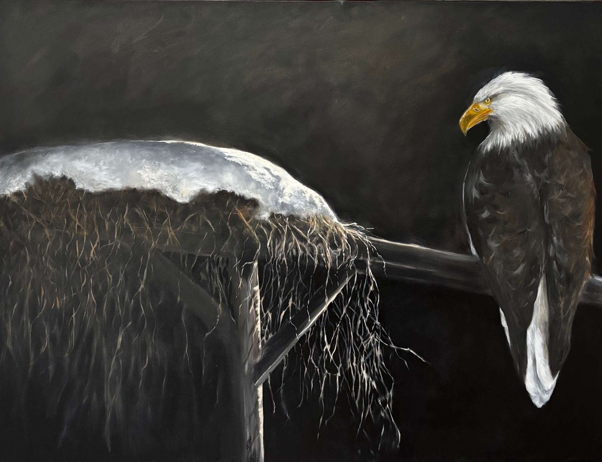 An adult bald eagle perches beside its snow-covered nest, surrounded by signs of neglect and abandonment. Once a symbol of national strength and vigilance, the eagle now stands watch over a home that has been left behind. This piece explores themes of patriotism, erosion, and quiet endurance—asking what remains when the ideals of a nation begin to fray. The sentinel is silent, but its presence speaks volumes.