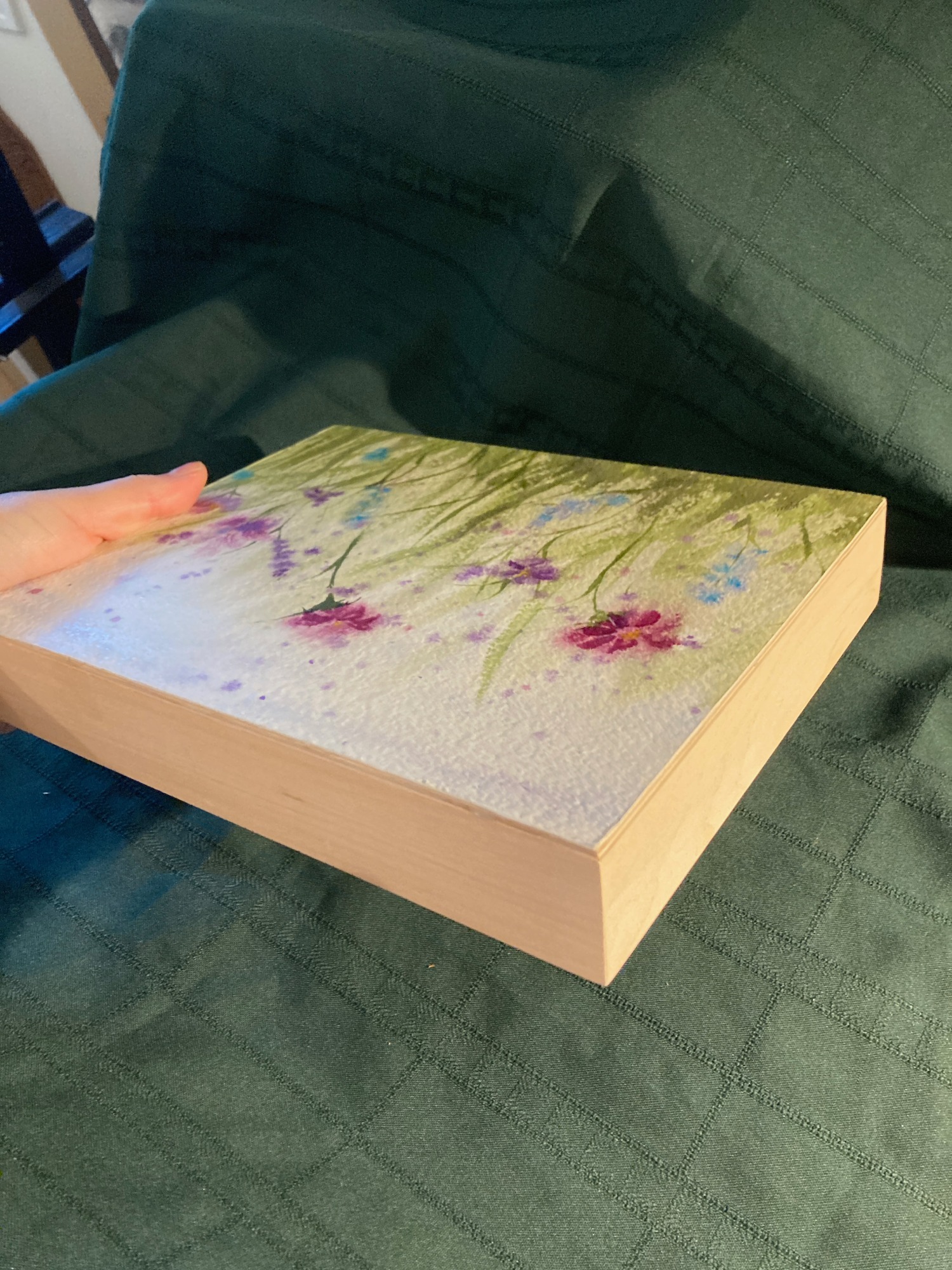 Painting has been created on 100% cotton paper and mounted on cradled wood panel and waxed for protection.