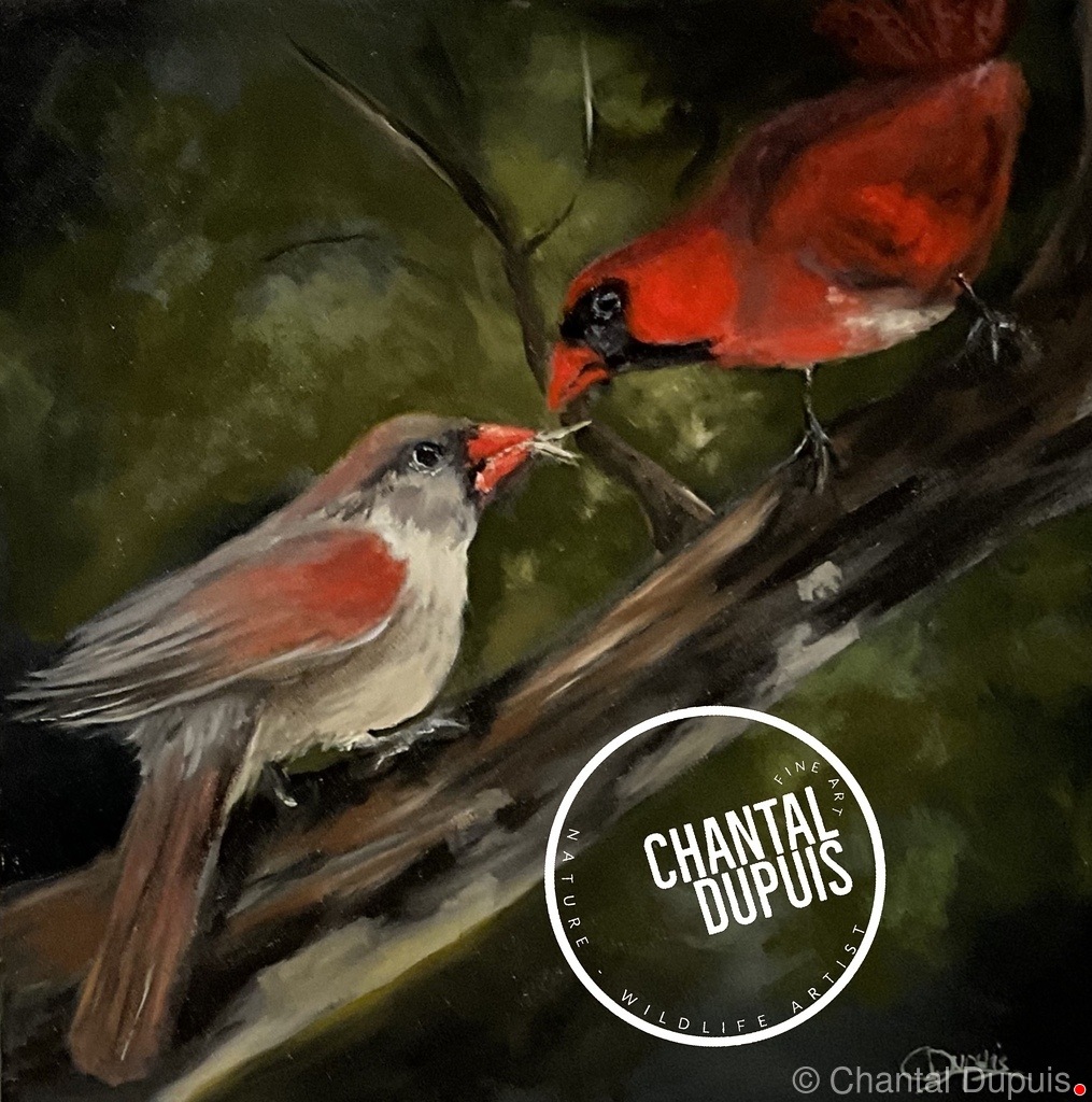 I love birds but the ones that I am always attracted more to are the little ones I see in my yard all the time. This couple lives in Ottawa and are sharing the first twig. Oil painting on cotton canvas.