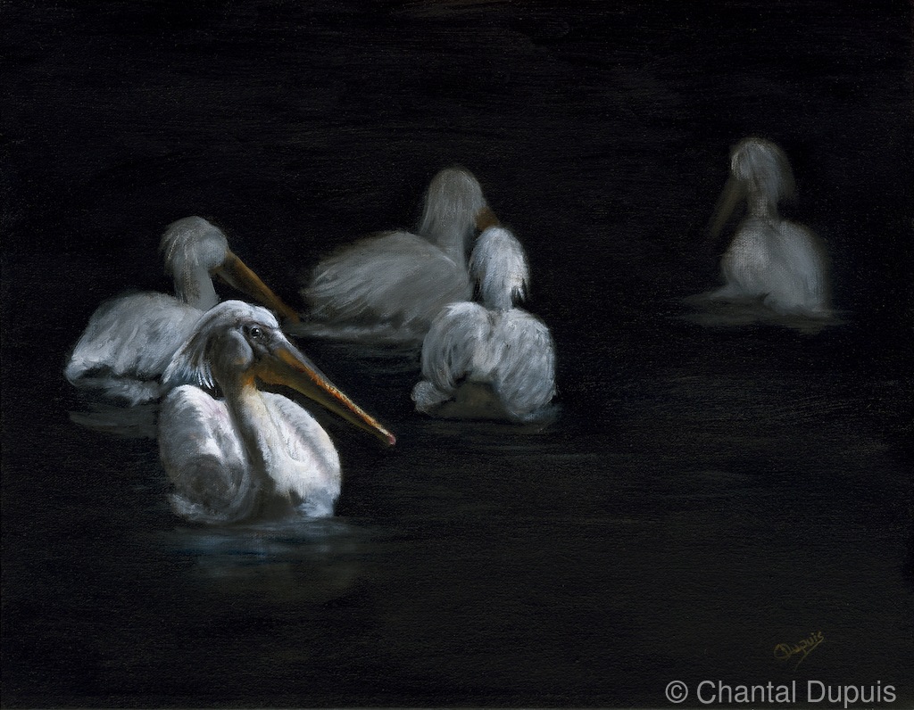 The Last Full Moon by Chantal  Image: white pelicans on water at sunset