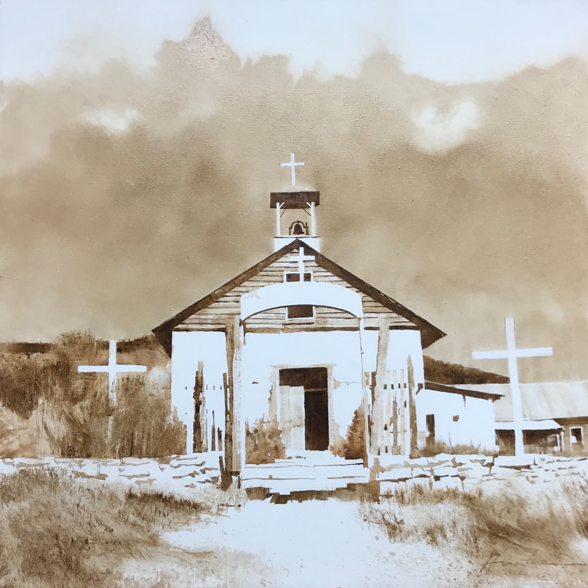 MessageDuring the pandemic year of 2020, unable to travel to New Mexico for one of my usual snaphot-and-sketching trips, instead I have been poring over the Farm Security Administration depression-era photos of rural New Mexico. When working from iconic source material, I think it important to not seek out images with dynamic, individualistic compositions, but instead to work from photographs that are more loving, straight-on gazes. This unassuming church in Holman, NM (between Las Vegas, NM and Taos), photographed by the great Russell Lee, enchanted me.