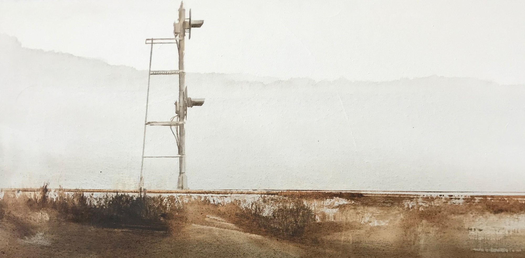 MessageOne of the good things about the internet, besides cat videos, is the ability to find a group of like-minded people. I really like railroad infrastructure (in case you couldn't tell already), and am always on the lookout for good source material depicting signals, semaphores and crossing gates. One day, perusing the Signals, Semaphores and Crossing Gates group on Flickr, I came across the photography of Cade Smith. Cade is a magnificent photographer of trains and their habitat, and has been kind enough to let me develop a number of paintings from images of his. I often radically change the locale of a particular bit of railroad detritus, but I figure the chances of a member of the Signals, Semaphores and Crossing Gates group calling me out on it ("Hey! That photo of Cade's shows a USS single target in the swamps of Louisiana and you moved it to Utah or somewhere") are pretty slim.