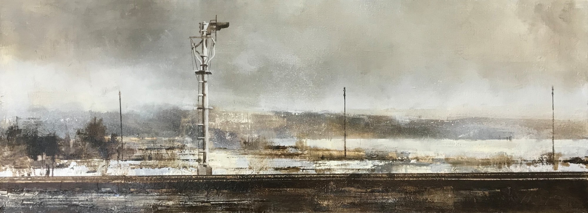 MessageThis painting had a long, undistinguished career as an unfinished work, standing on its head. It was over in a corner of my studio one day, minding its business, when, fresh from a trip to Wyoming, I took a look at it and thought, "upside down, it sorta looks like Thermopolis" (that's a town in Wyoming, in case you're not up on Wyoming geography). So I went to work on it, and darned if I wasn't right. It just needed the signal as a dominant vertical to anchor all those horizontals.