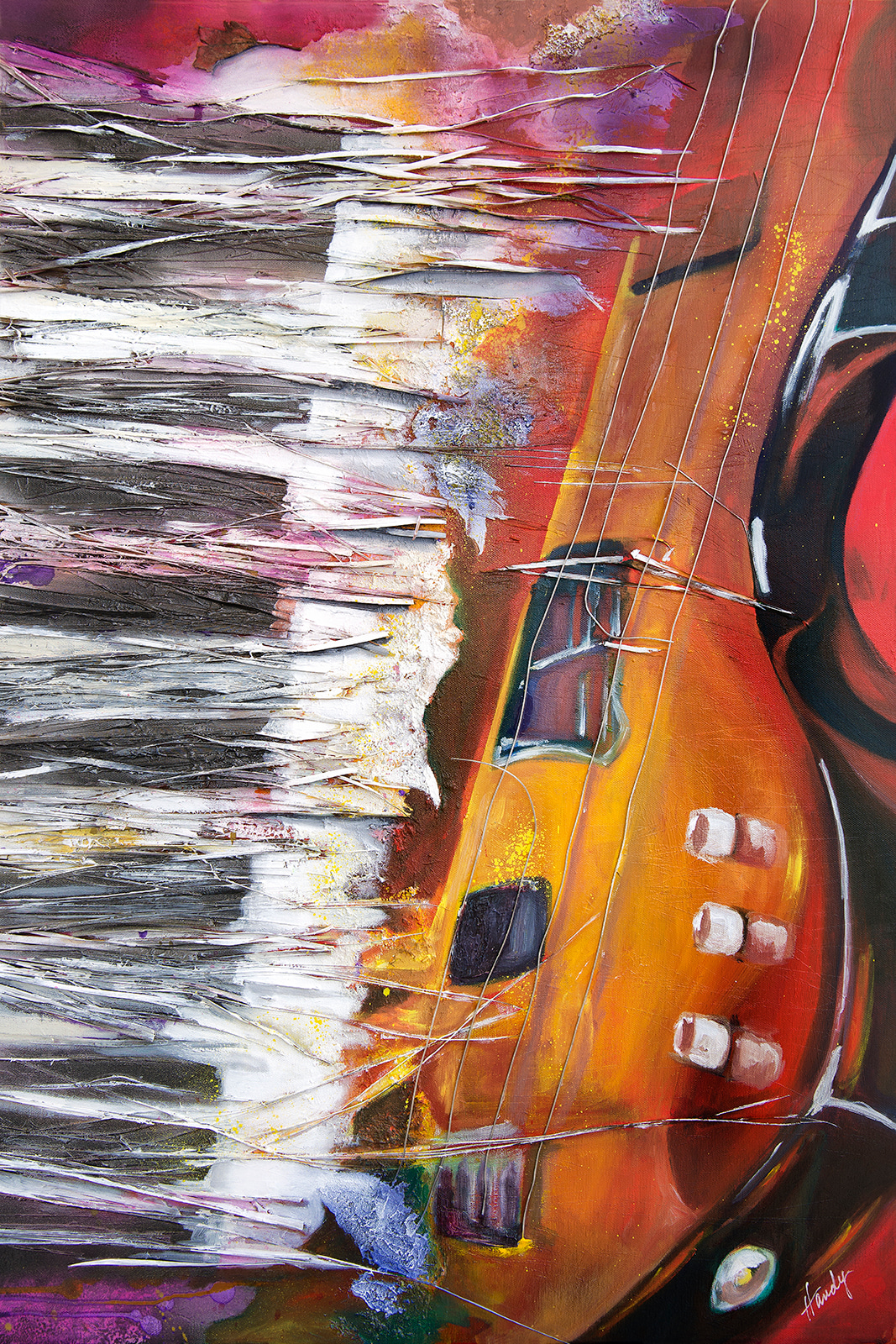 keyboard and electric guitar on colorful background with grasses and wires attached. melodic.