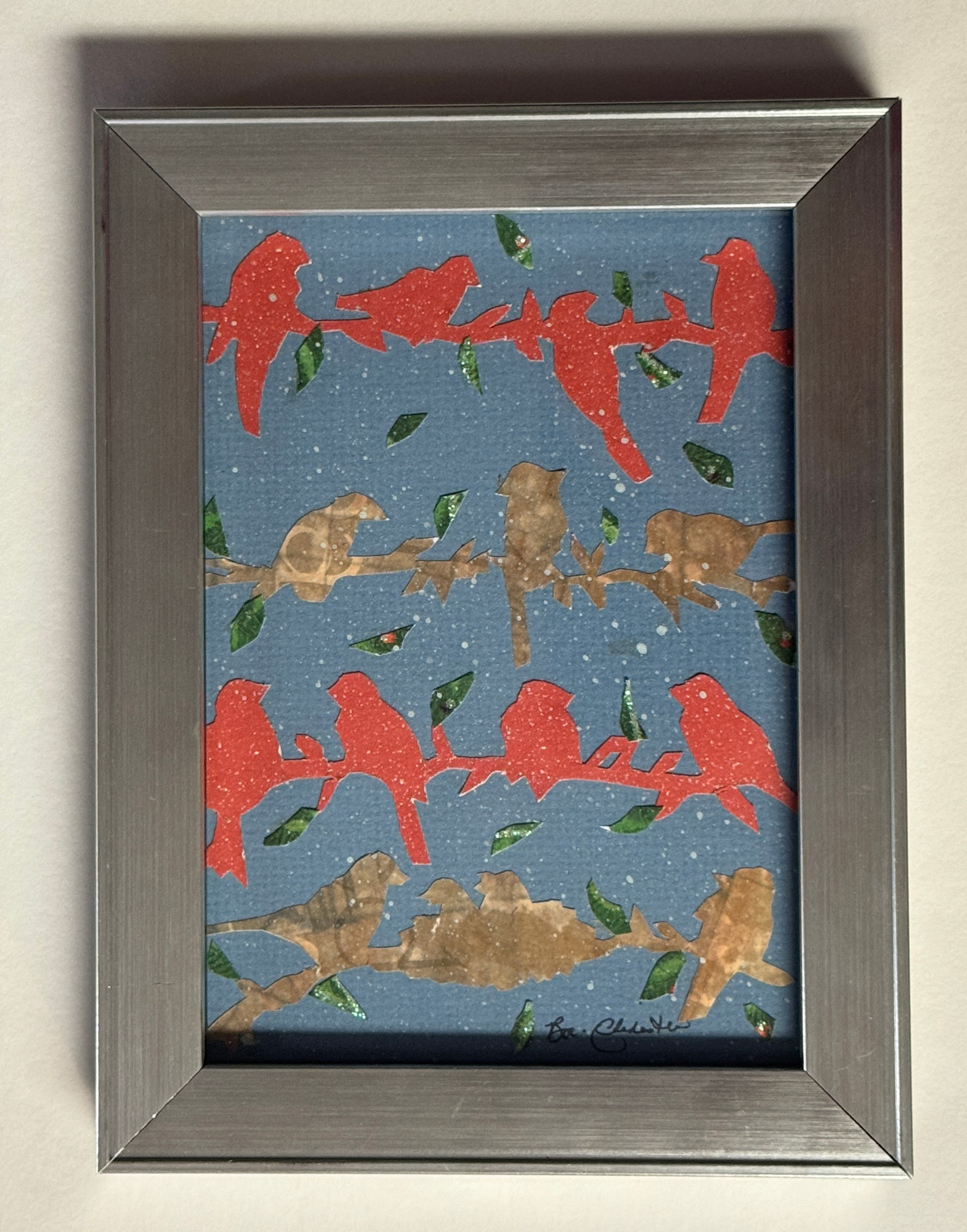 This piece was inspired by winter birds in my backyard. The Polish folk art tradition of wycinanki inspired this piece of art. The paper is hand-cut and the design original. It is framed with conservation material