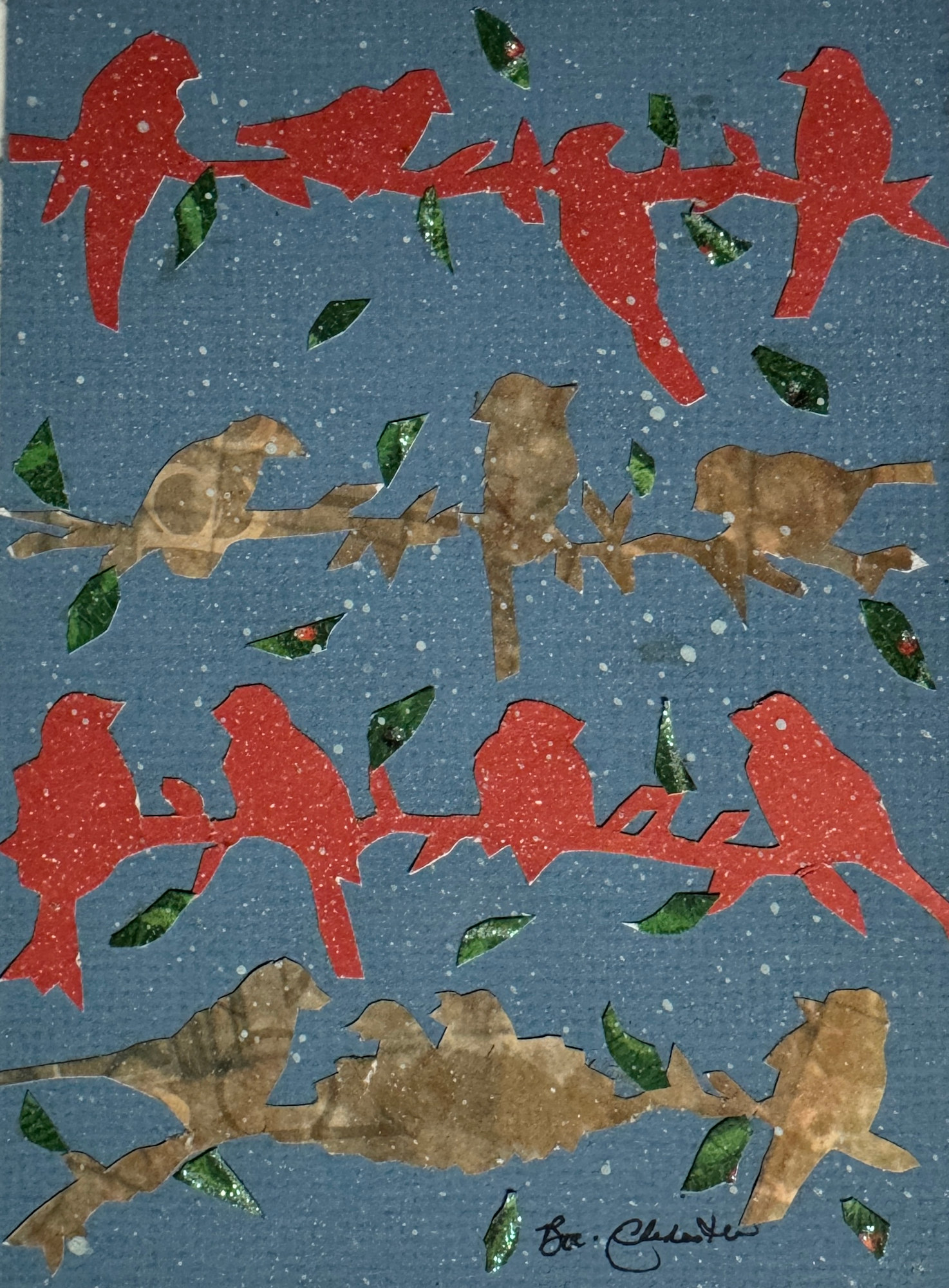 This piece was inspired by winter birds in my backyard. The Polish folk art tradition of wycinanki inspired this piece of art. The paper is hand-cut and the design original. It is framed with conservation material
