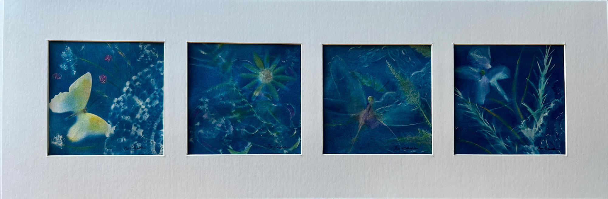 Cyanotypes are camera-less photography. UV light develops the image and water fixes it. Objects that block the sun, appear as ghost images.