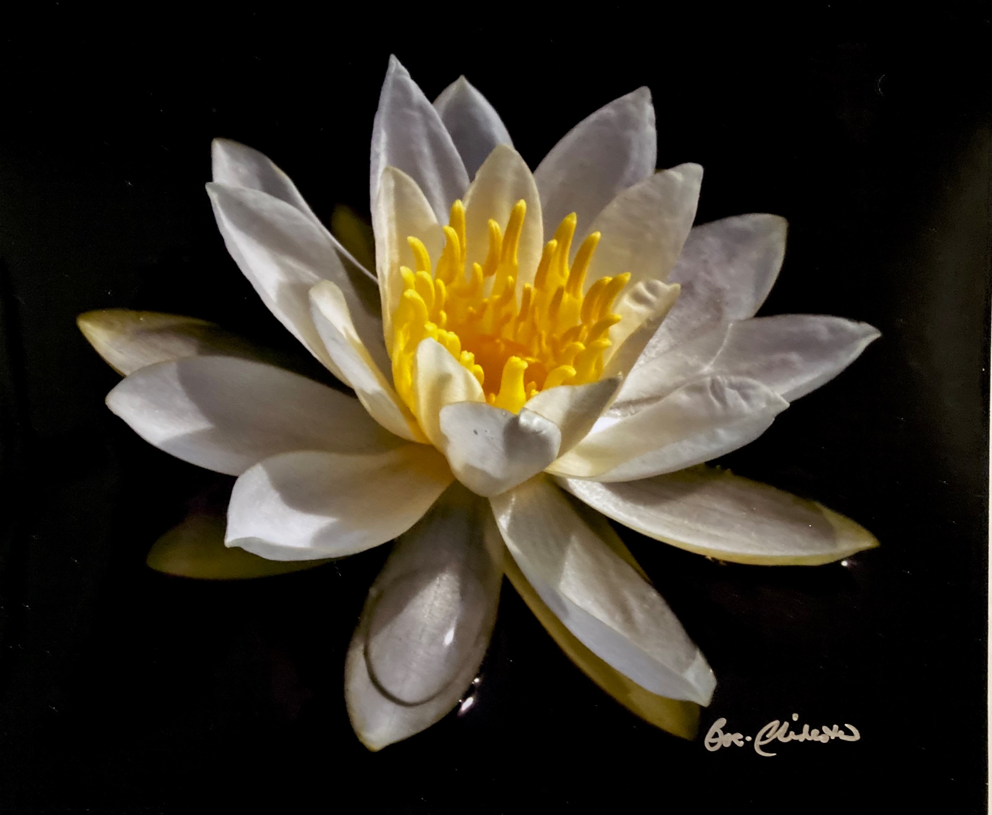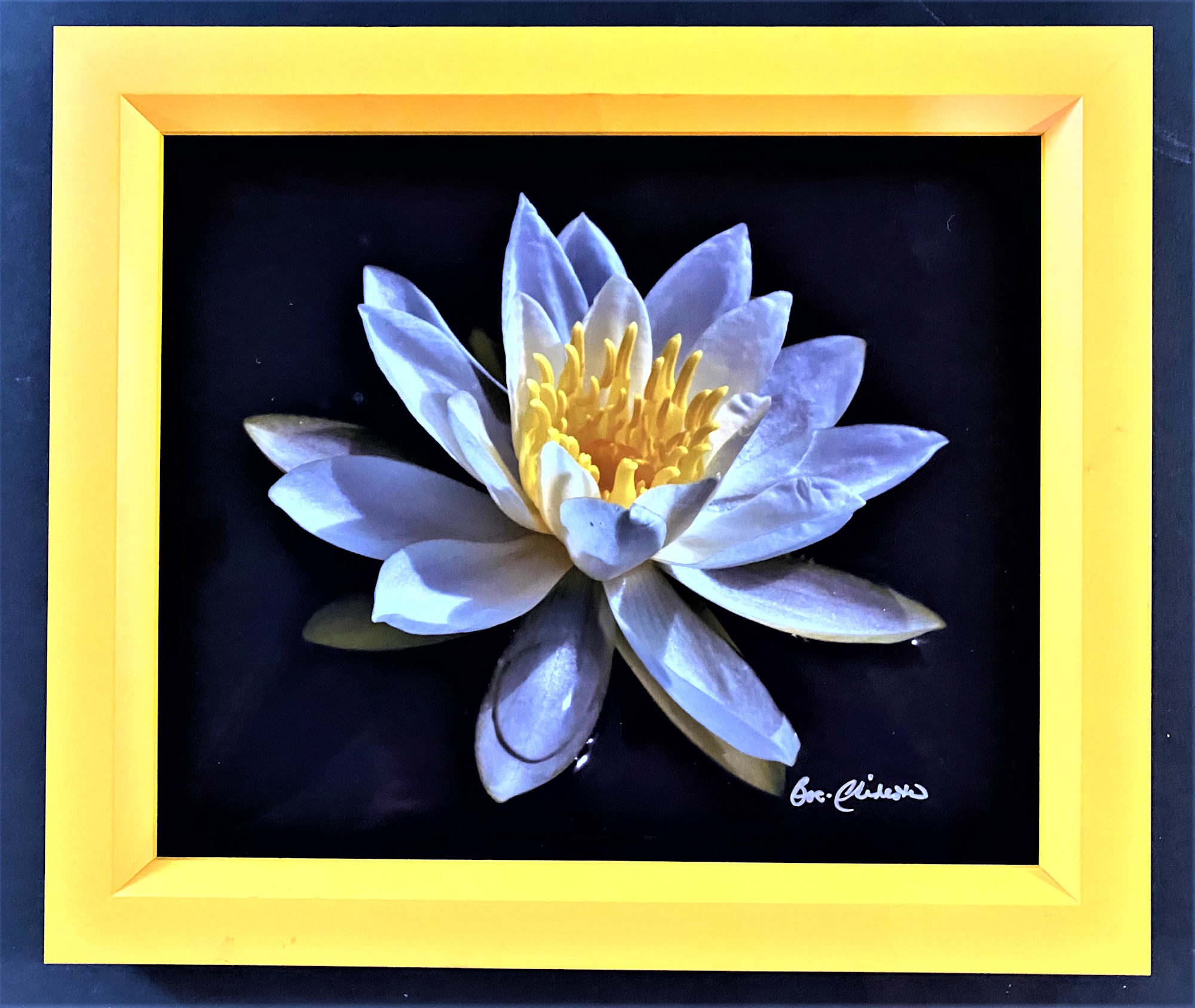 This image was taken while kayaking in Northern Michigan on a late summer's day. I strived to capture the fleeting beauty of this flower as I floated by. The work is framed with conservation materials and a yellow wood frame.