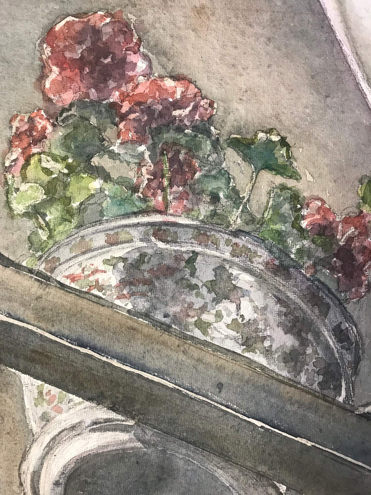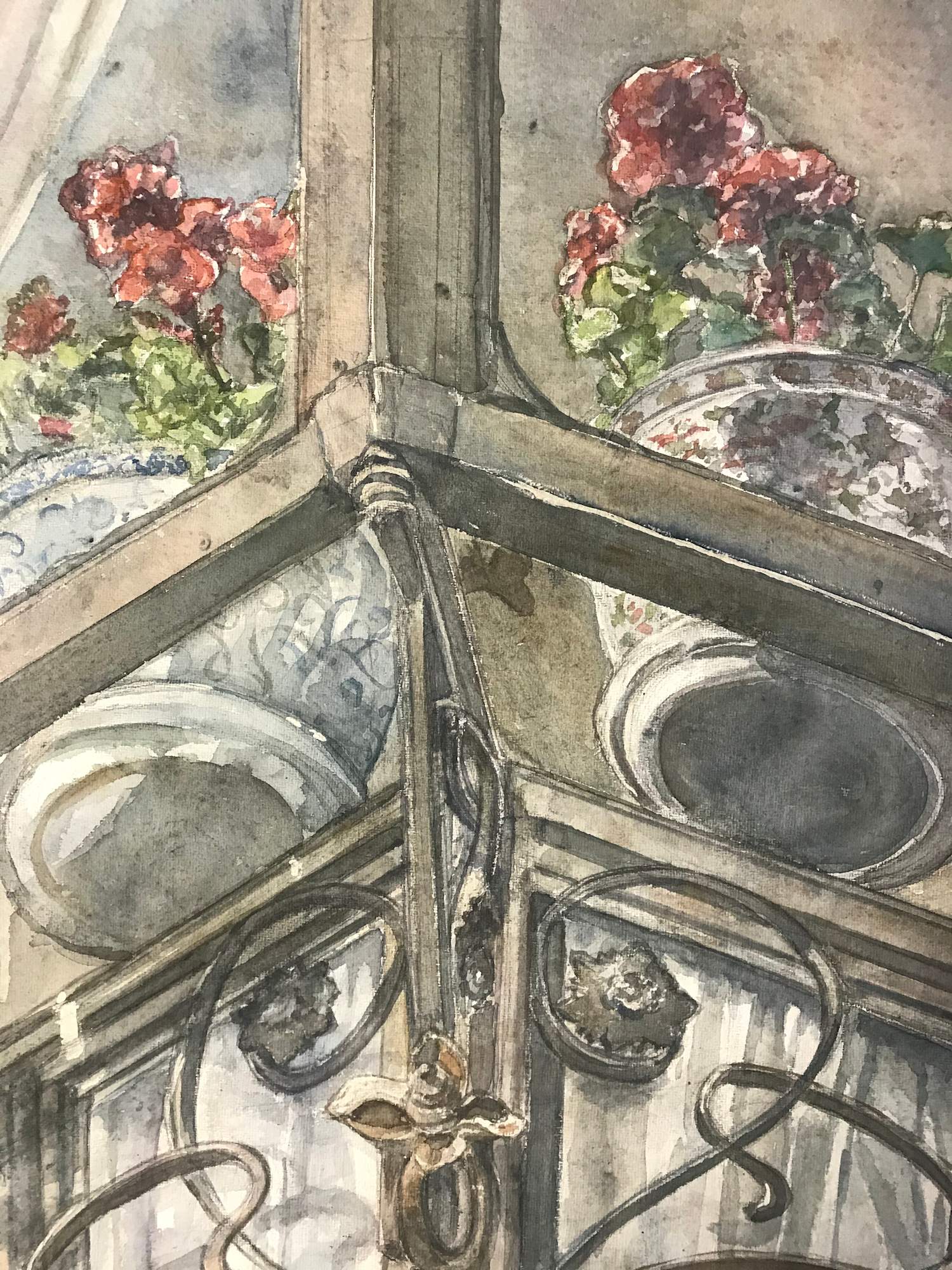 This watercolor, painted on handmade paper is matted with a near-white conservation mat using conservation clear glass and a complementary frame to give its approximate total dimensions of 39 1/2"x33 1/2". The view of geraniums inside a shallow glass oriel window was inspired by a recent visit to Segovia, Spain. The wrought iron of the windows and the way the light fell on the elements influenced the "feel" of the piece and offers a glimpse of a way of life.