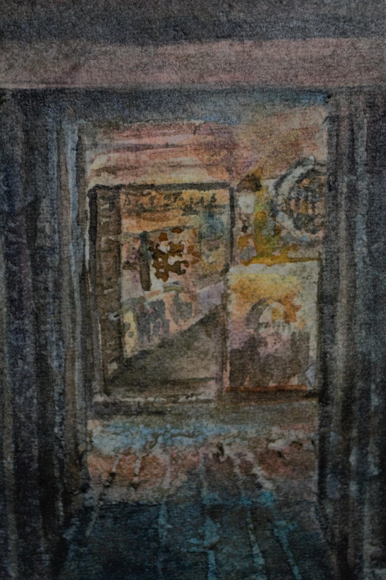 Meandering through Venice at dusk is magical with another-worldly light. The ogee arch invited me to venture to the art gallery on the other side of the alley. The scene is painted with watercolors on handmade paper with touches of a water-based gold wash.