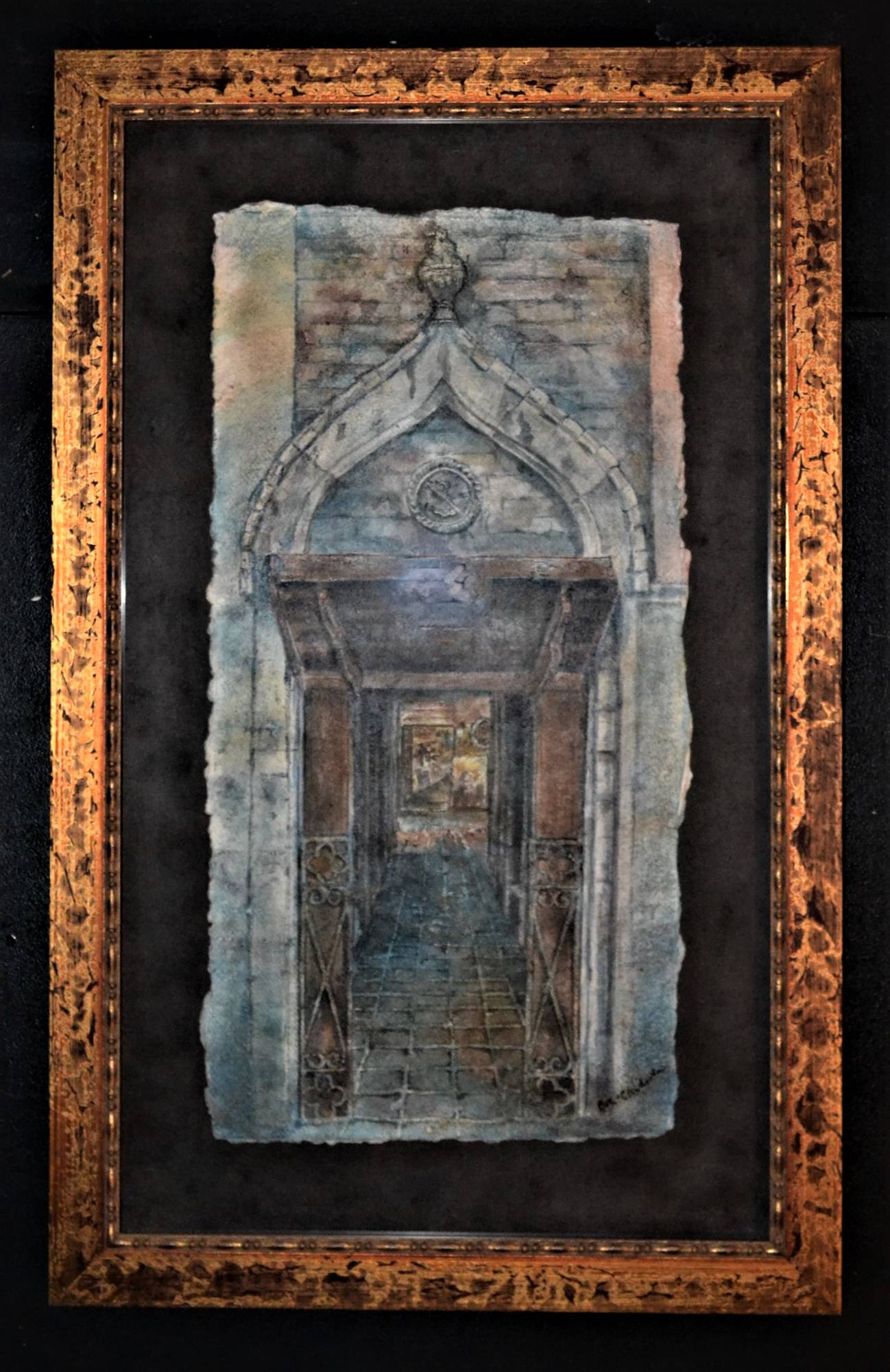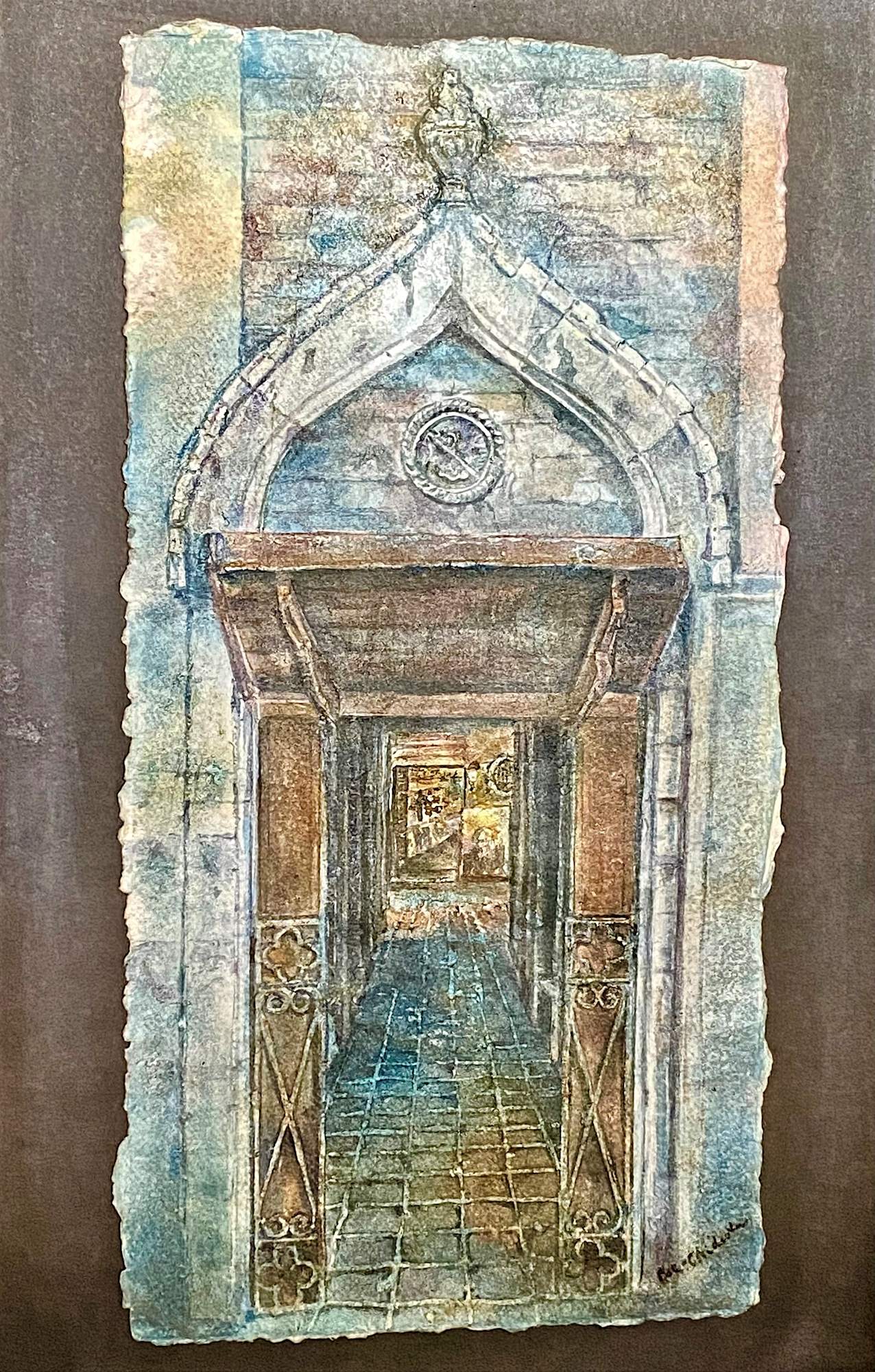 Meandering through Venice at dusk is magical with another-worldly light. The ogee arch invited me to venture to the art gallery on the other side of the alley. The scene is painted with watercolors on handmade paper with touches of a water-based gold wash.