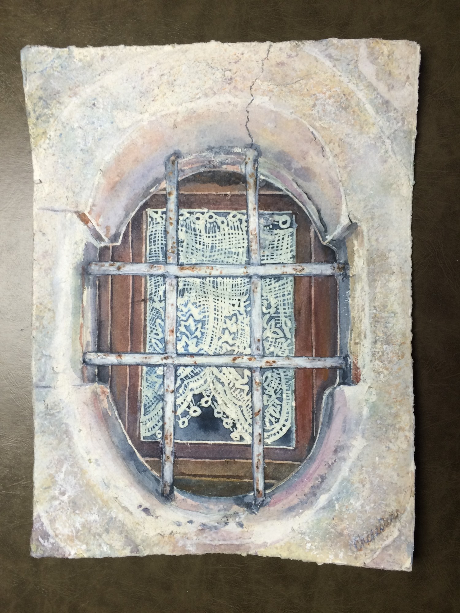 This painting was inspired by my long walks in Venice, Italy. Where the light is like no other in the world, even modest details of small residences offer inspiration. The work was created on handmade watercolor paper using watercolors, powdered charcoal and gesso giving it depth and texture. The art is float-mounted on leather-textured mat board with spacers placed between the art and the conservation clear glass and framed with complementary molding.