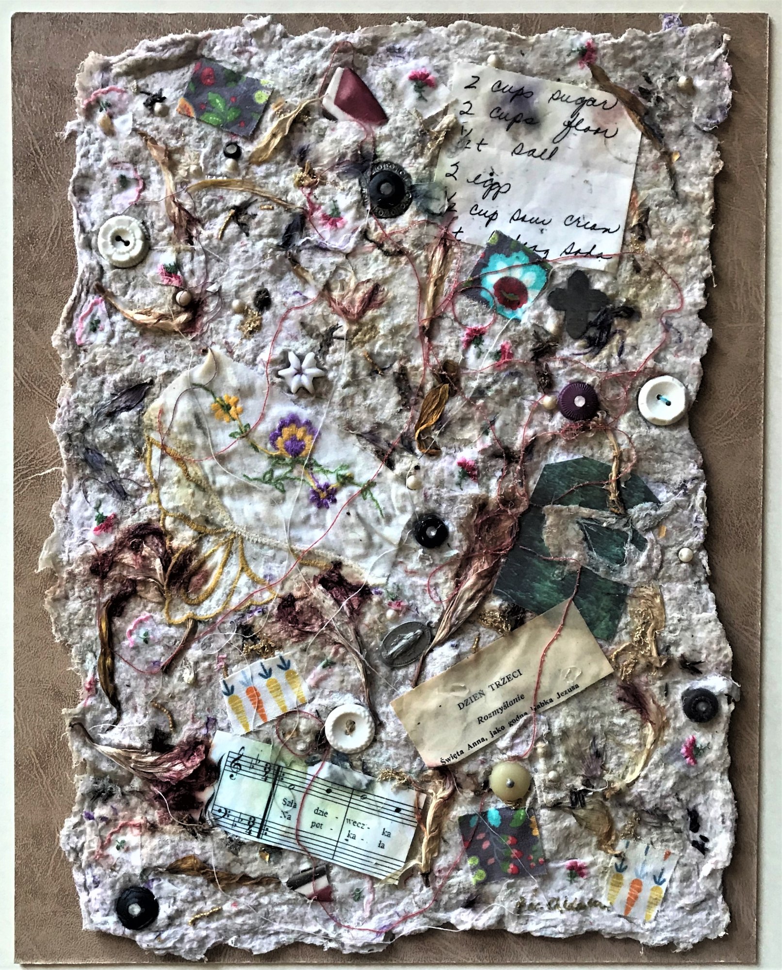 This piece tells the story of the women in a family. Each object represents a family member. The paper is made from vintage handkerchiefs and the frame is also vintage. Together they create a collage of their lives.