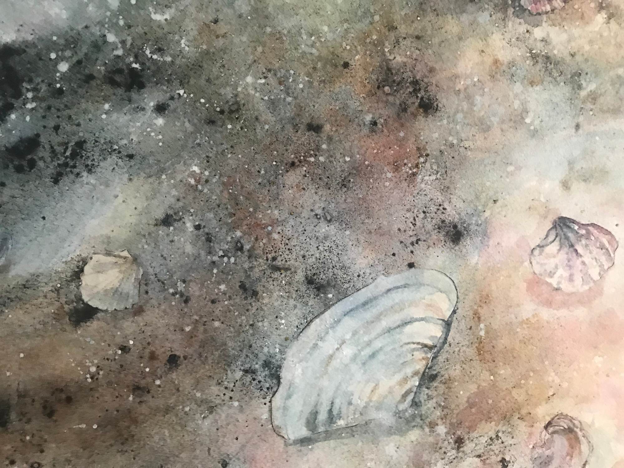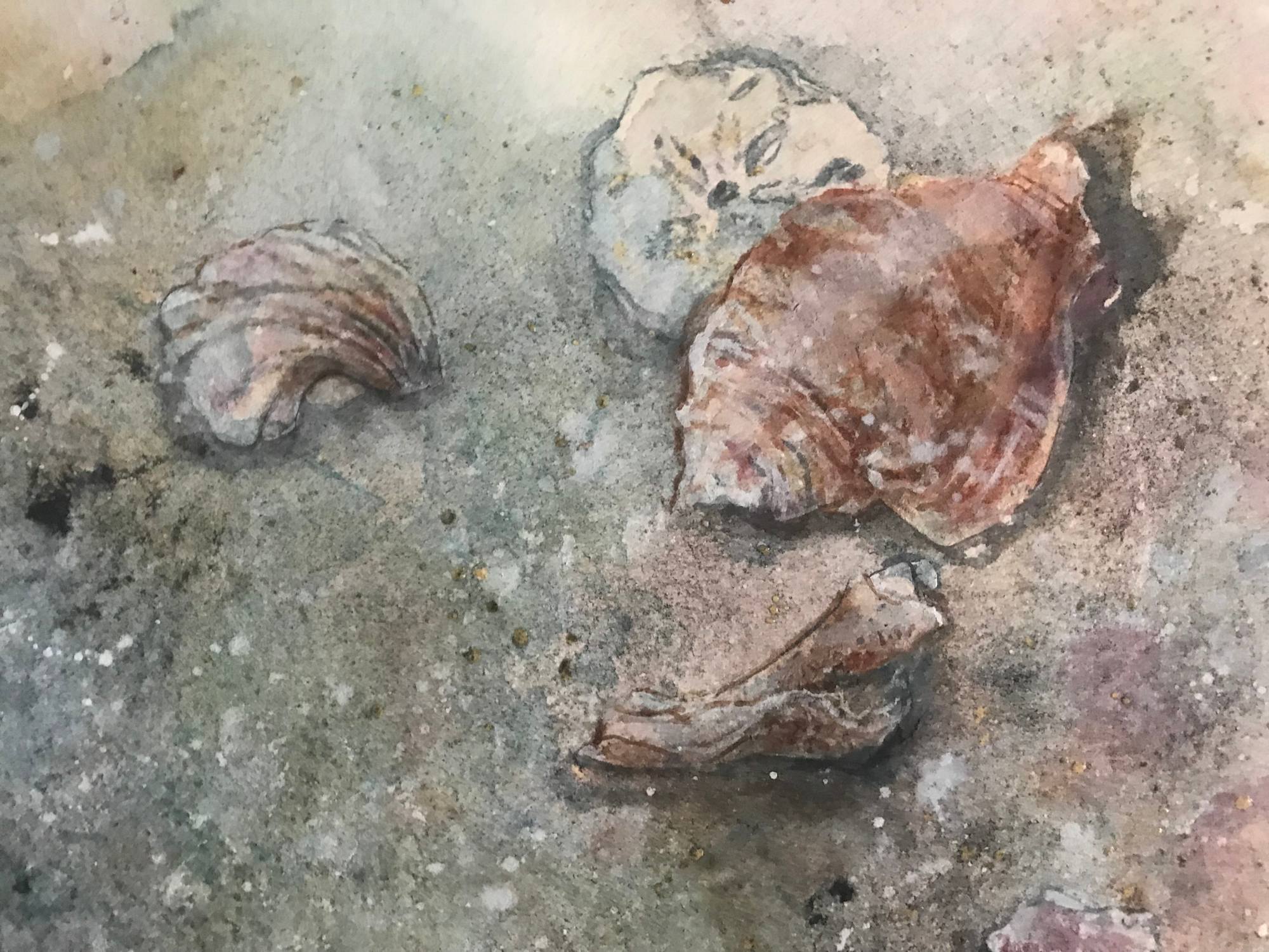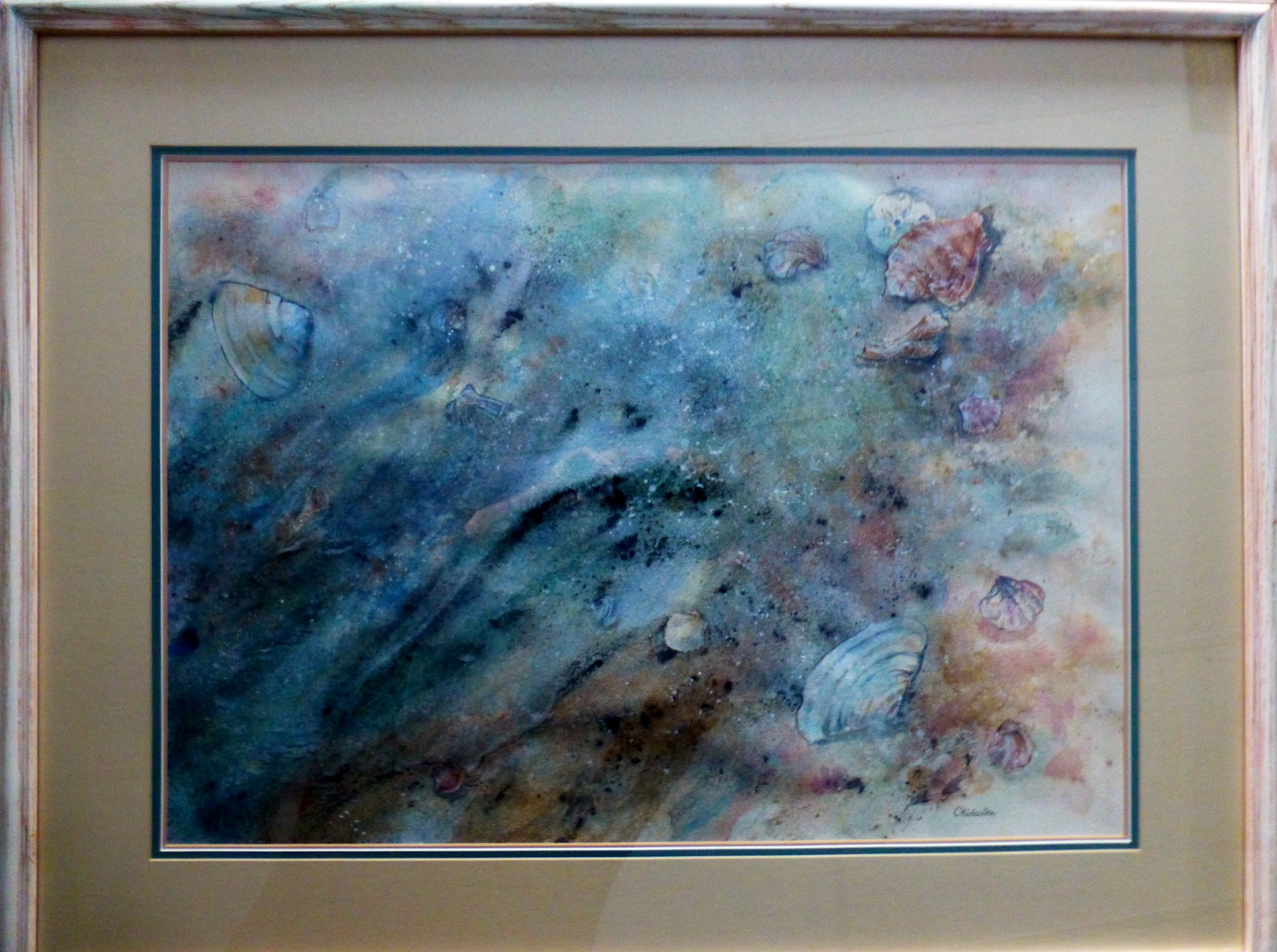 This painting brings back warm memories of walking a beach and collecting shells as waves gently rush over your feet. Created using powdered charcoal and watercolors on handmade paper, it is triple-matted and place in a hand-painted frame with conservation clear glass.