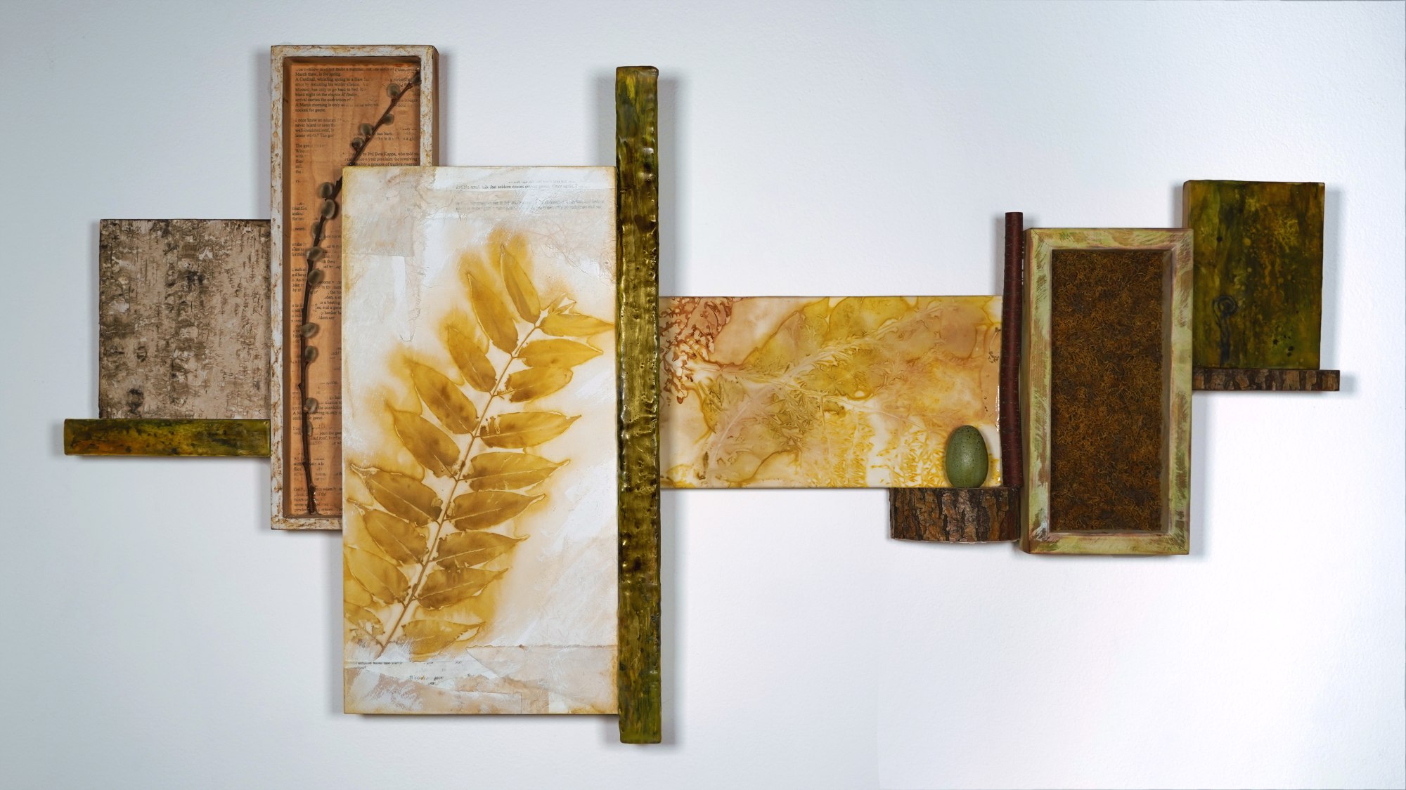 This assemblage was inspired by a spring color palette ranging from neutral pussy willows to the mossy greens starting to emerge. The transferred text behind pussy willow is from the March chapter of "A Sand County Almanac‚" by Aldo Leopold.