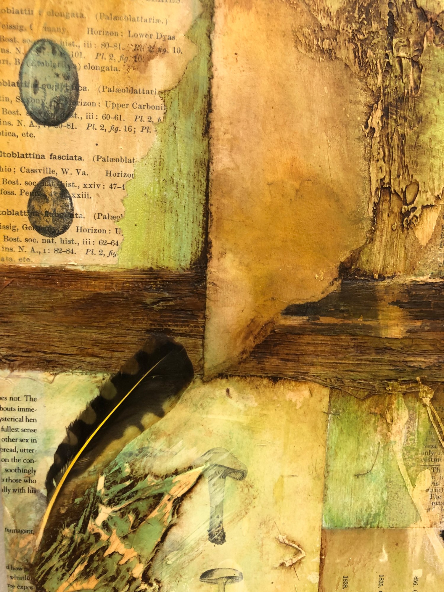 Yellow flicker feather, swallowtail wings, papyrus, paper birch bark, pages from encyclopedia Britannica and nature guides, acrylic, ink, and pastel on panel