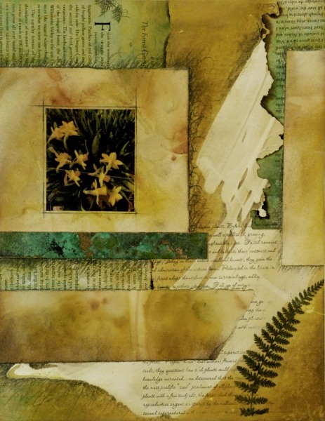 These little Daffodils were the first bit of color I saw this spring. The background is a combination of collage and transferred text on mosses and the history of ferns. The fern included is a copy of a specimen from Ireland. Ecoprints and patinaed copper are layered over loose painted and pastel backgrounds.