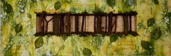 Acrylic, graphite, dogwood twigs, birch bark, and moss on panel.