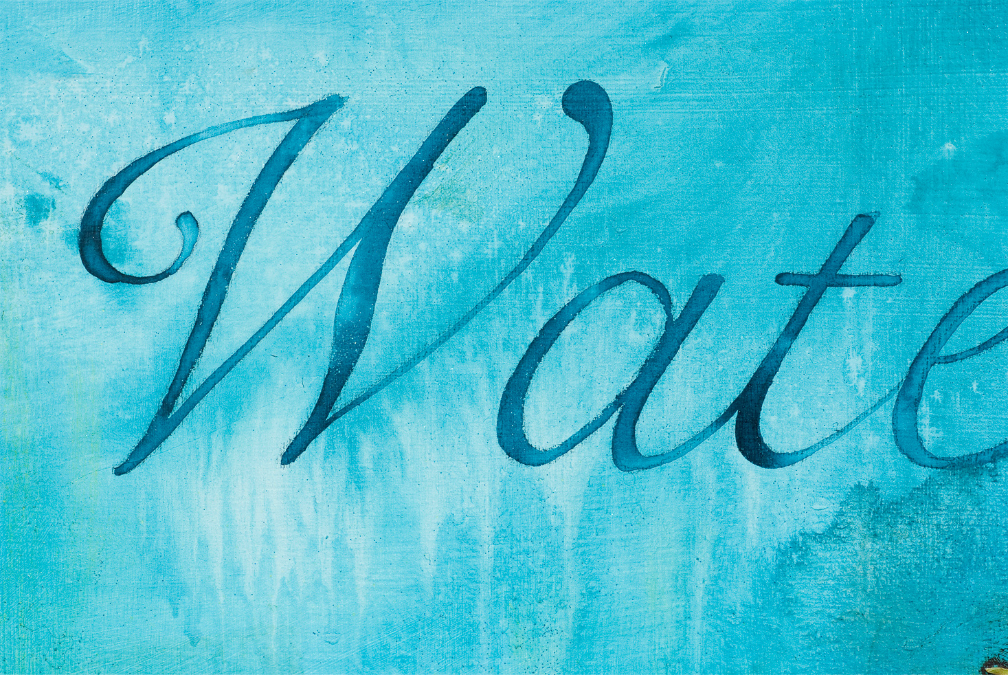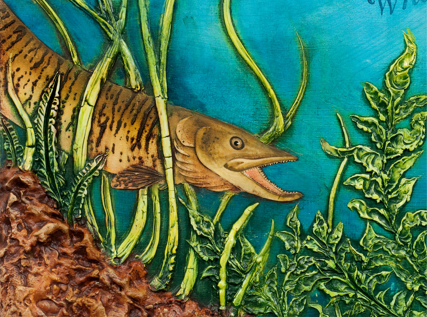 "Sister Water‚" is one of four feature commissioned pieces on the pediatric floors of the OSF St. Francis Medical Center in Peoria, Illinois. Geared to appeal to a young population, the theme of each floor is based on a portion of St. Francis‚'s "Canticle of the Creatures‚" that addresses different aspects of the environment. "Sister Water‚" was the piece that I connected with most. It is teeming with life! I thought that the use of water was obvious - so the pouring of the piece involved as much water as ink. An aerial view of the Illinois River as it flows through Peoria is sculpted into the middle panel. Species native to Illinois - bluegill, muskie, rainbow salmon, red-eared pond sliders (turtle), bullfrogs and tadpoles were rendered in low relief using modeling paste and ink on paper. I chose Snell Roundhand Bold as the text font for its flowing, feminine quality, and wrapped it to follow the flow of the water. The river bottom incorporates gravel, shells, fossils and human trash/remnants - pennies, bottle caps, and nails. The aquatic plants were inspired by lily pads, curly pondweed and wild celery. The insets in the river floor hold indigenous specimens and fossils. They are encased in resin, a strong clear substance that allows them to be seen, but not removed or harmed.