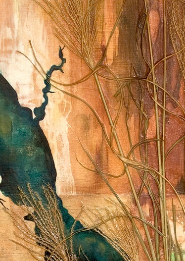 acrylic, sheet music, fossil, pods, feather, acorn, grasses, leaves, and maps on wooden panel