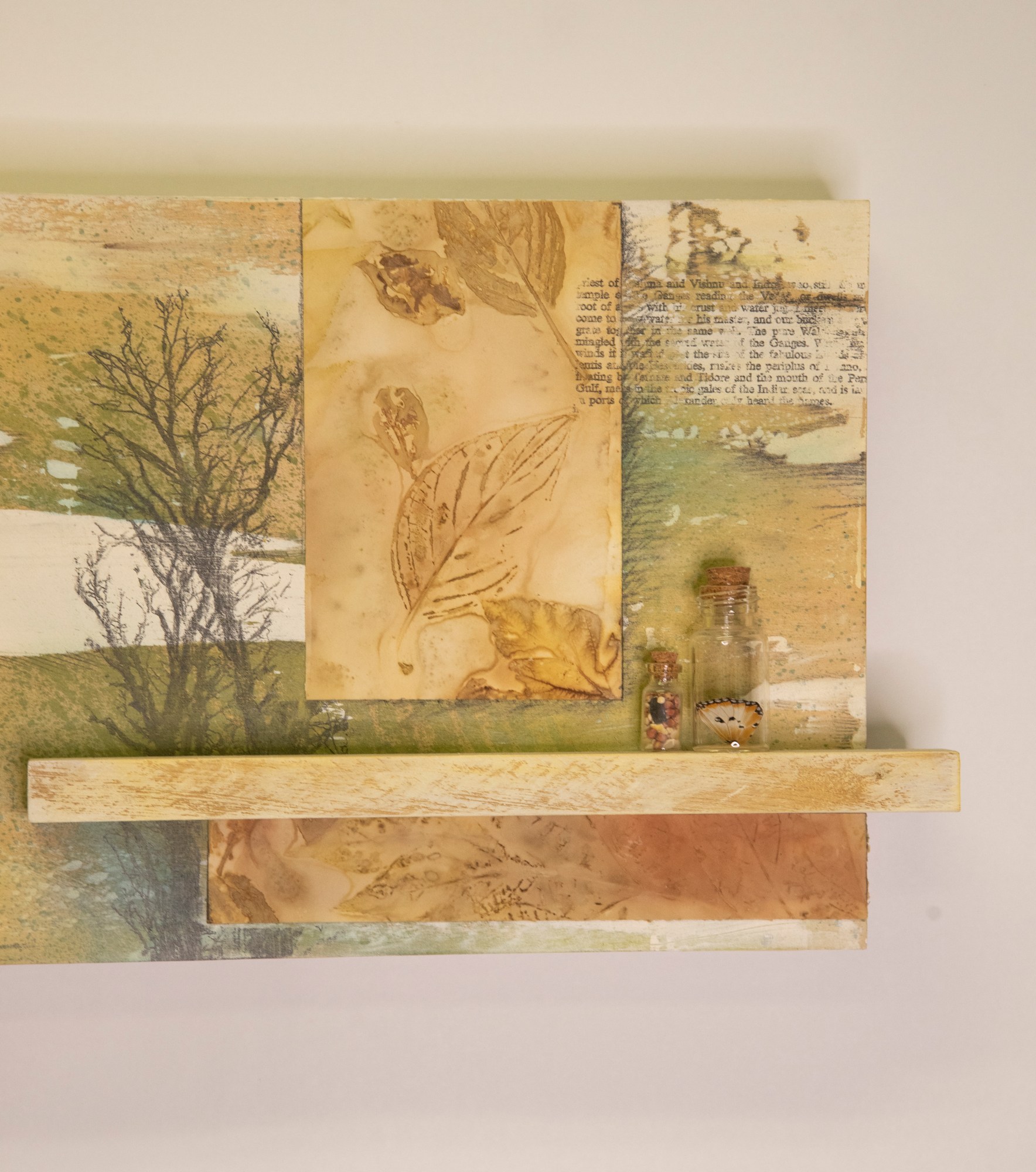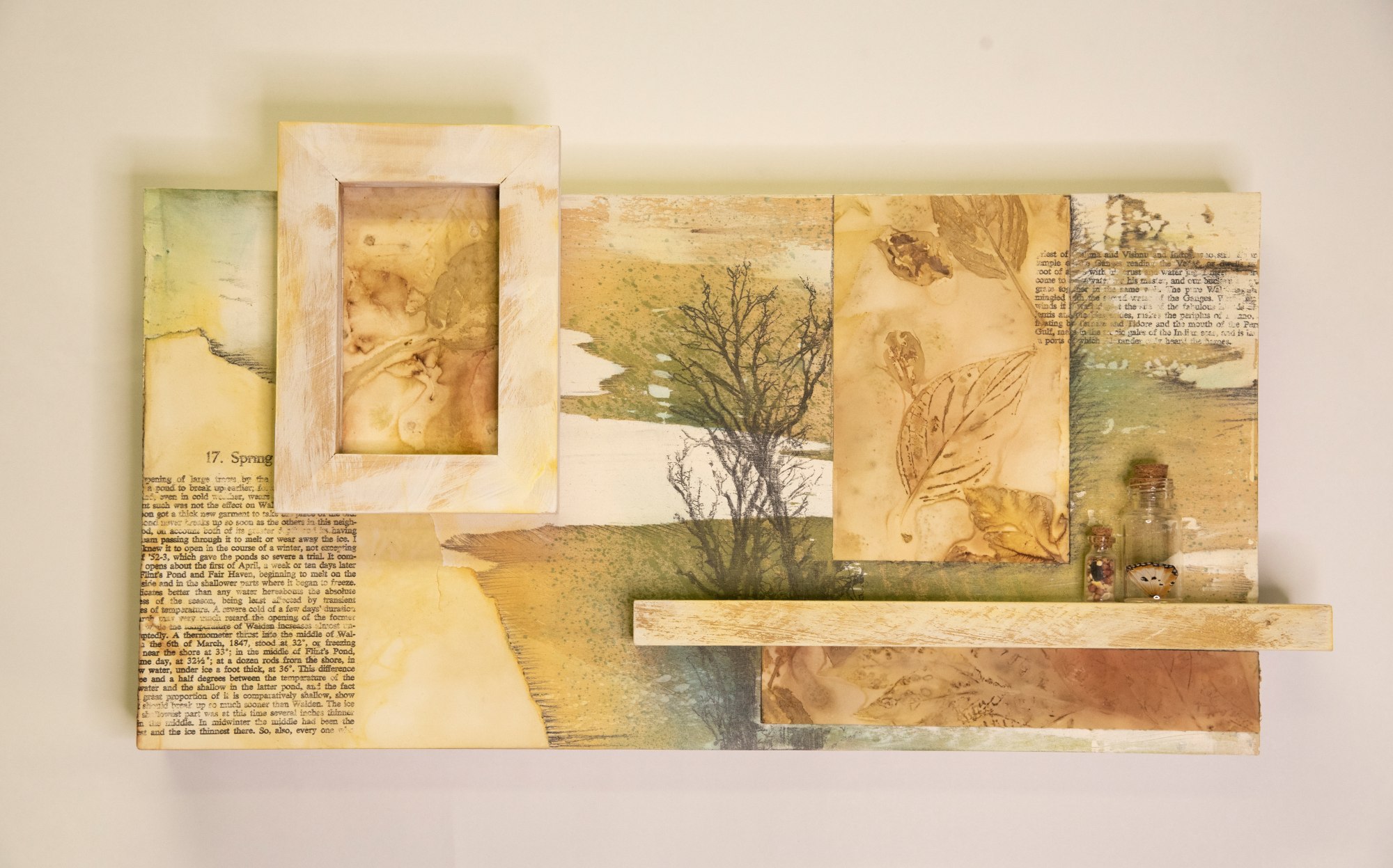Text from the spring chapter of ""Walden"" is overlaid onto a painted and poured panel with ecoprints. A shelf contains bottles with a butterfly wing (Danaus Alcipus) and seeds.