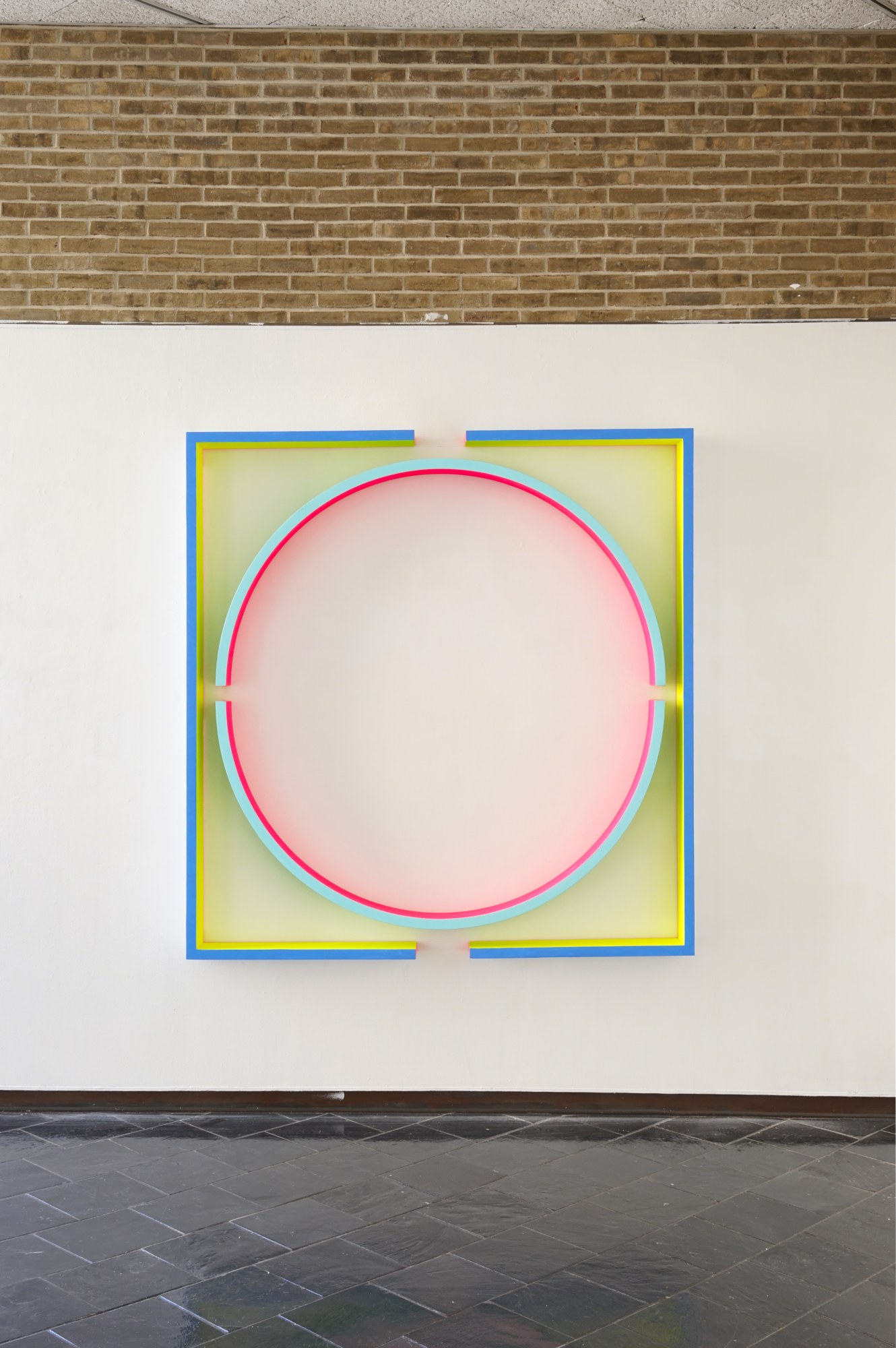 This sculpture is made up of four pieces. Color reflects from the artwork to create light pink, yellow, and green washes on white walls.