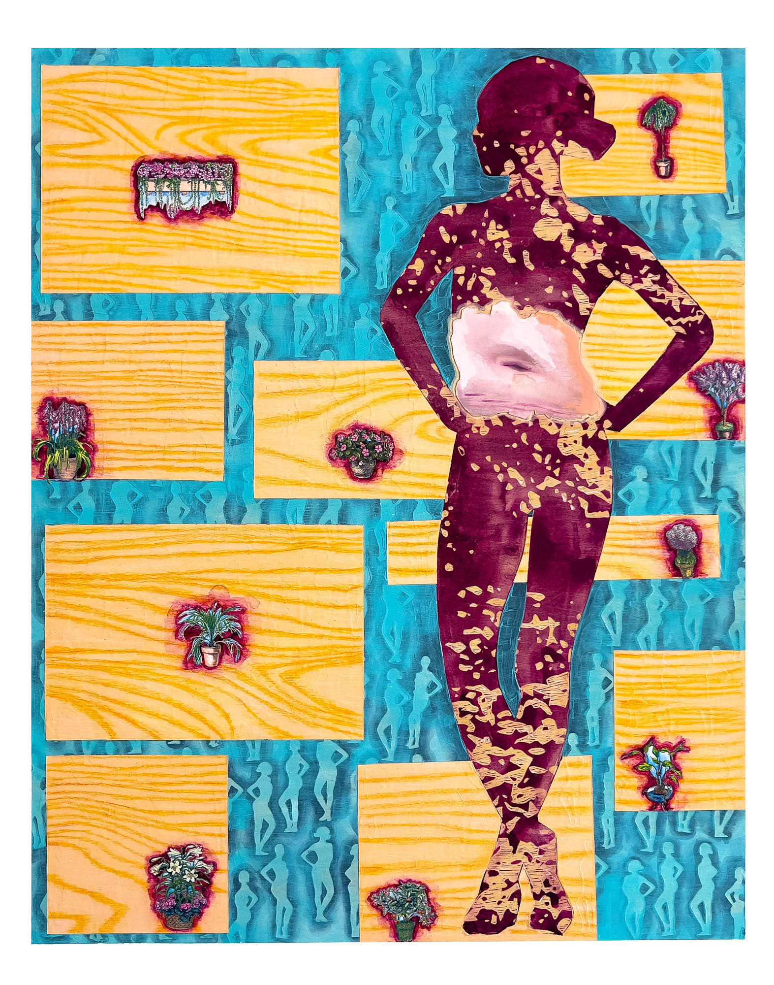Acrylic, collage, colored pencil, digital print, cochineal ink