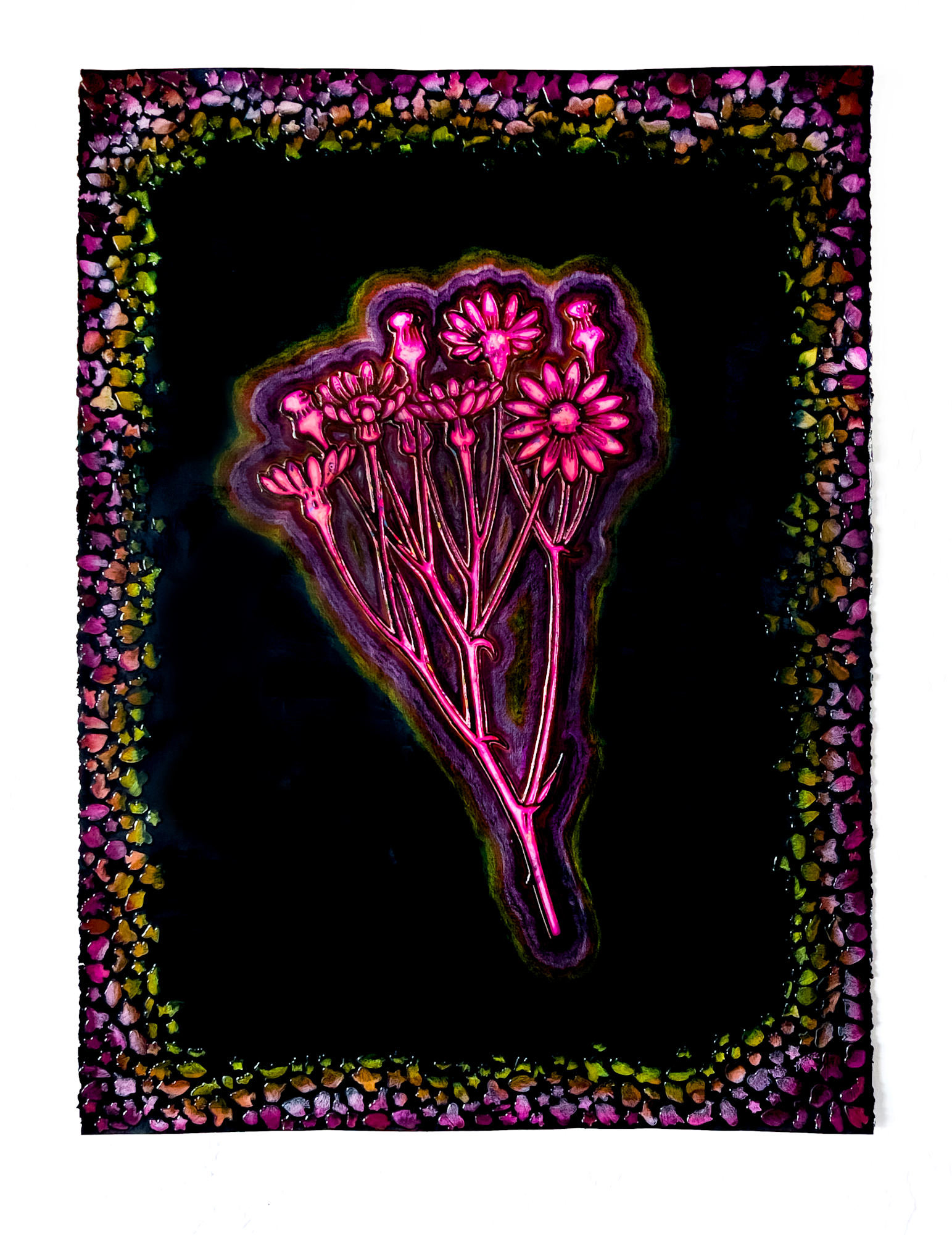 Flashe, acrylic, colored pencil, glitter vinyl, digital prints, Rives BFK paper