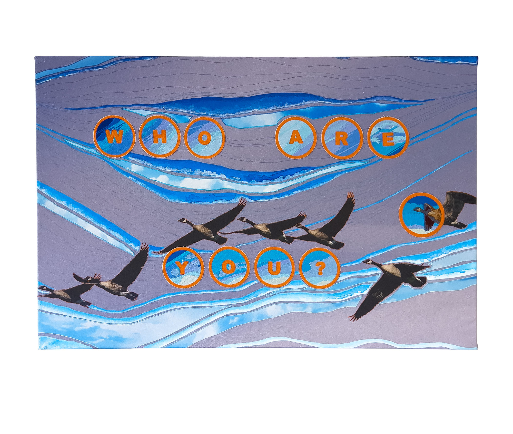 Digital embroidery on digitally printed stock photo on canvas, hand sewing, acrylic, found fabric