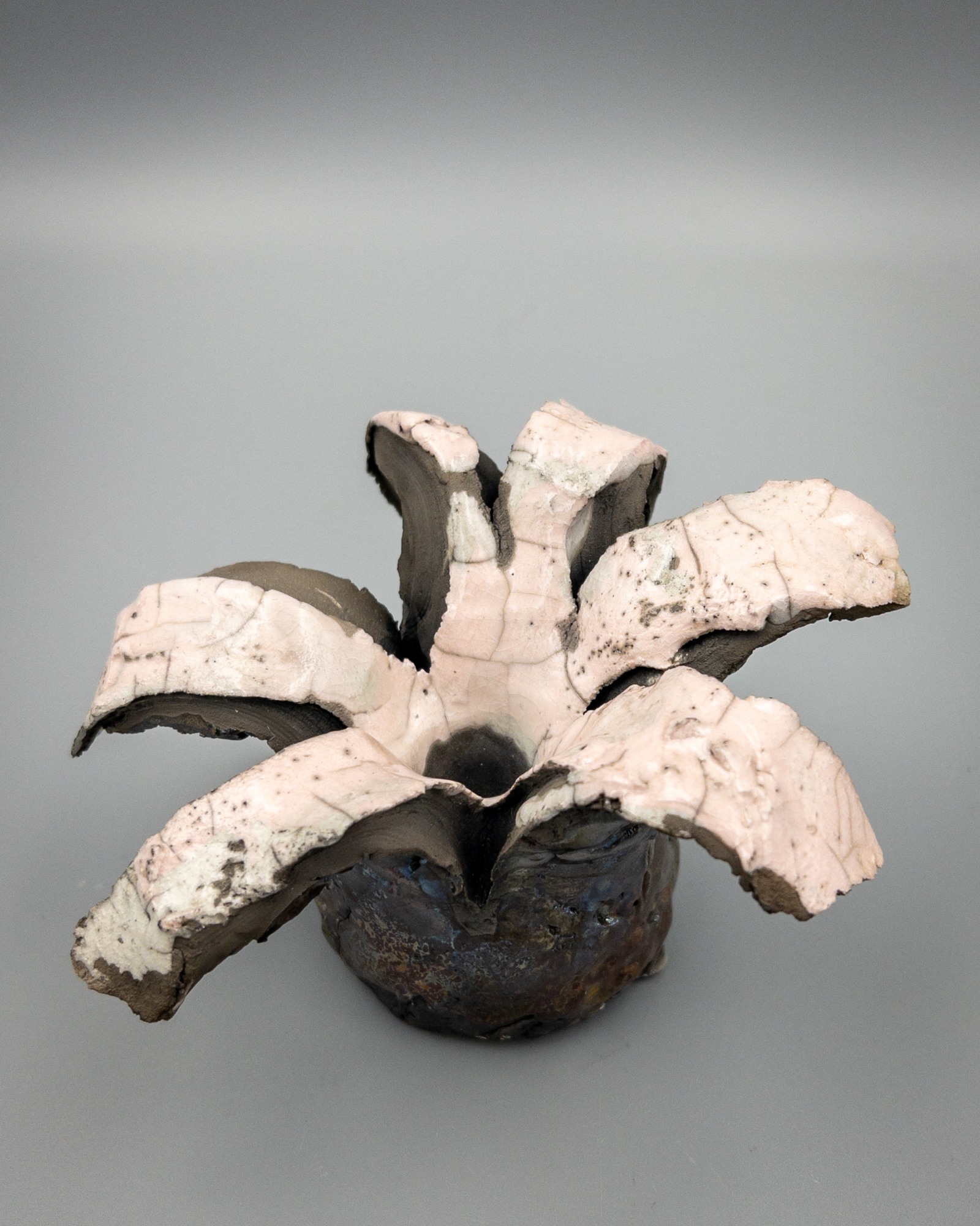 This piece was blown up using fireworks, glazed and then Raku fired.