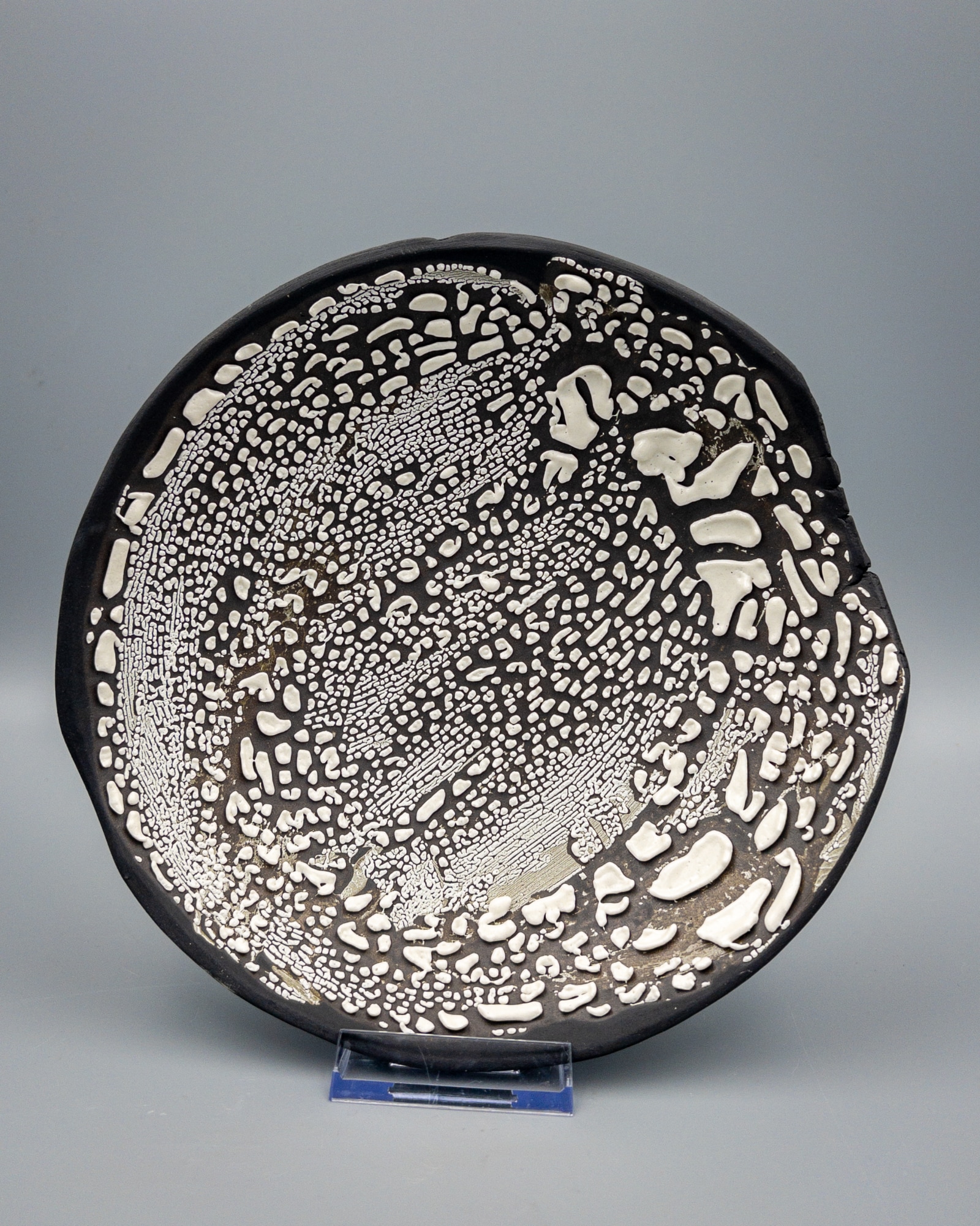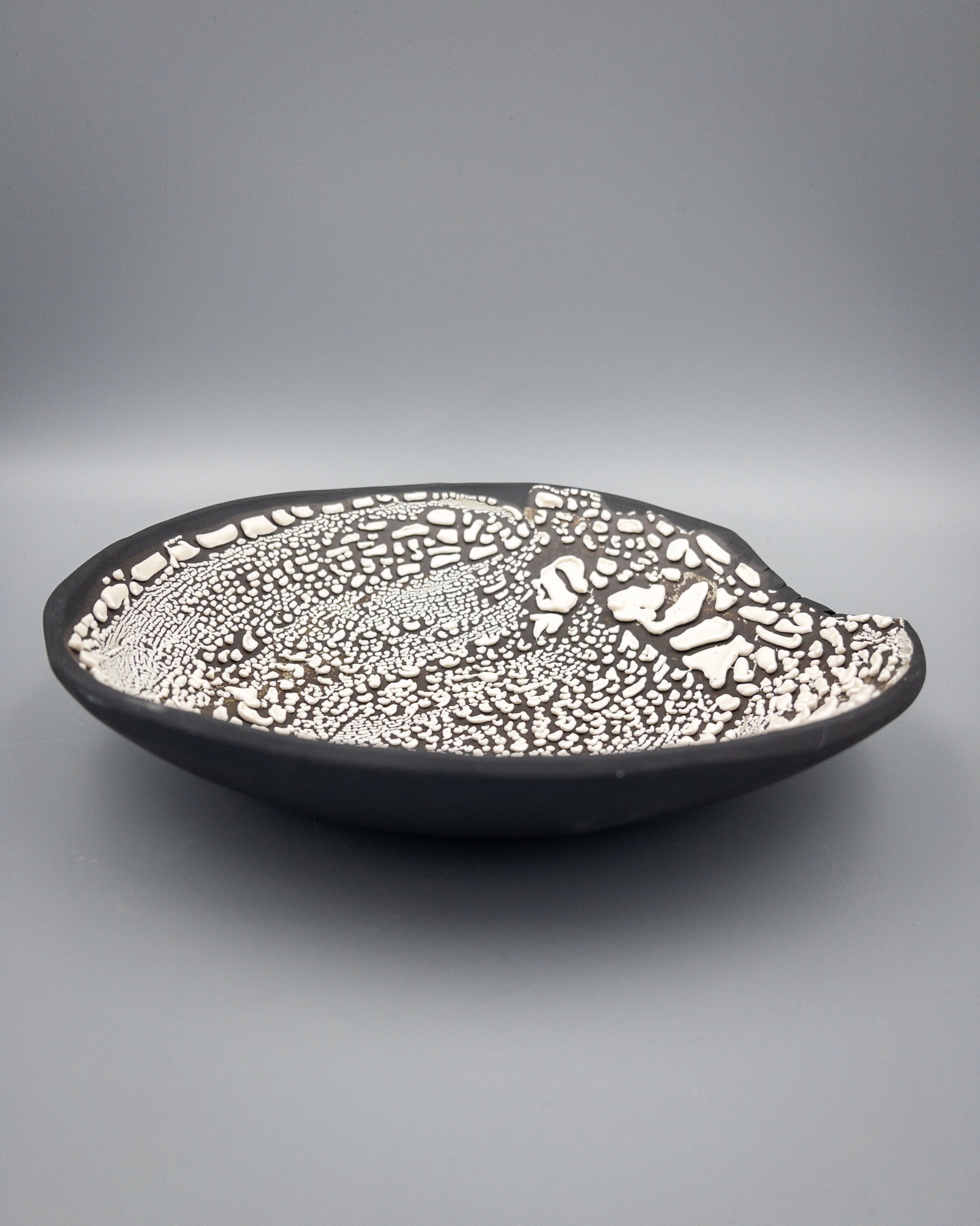 This bowl is made with black clay and glazed with a white crawling glaze.