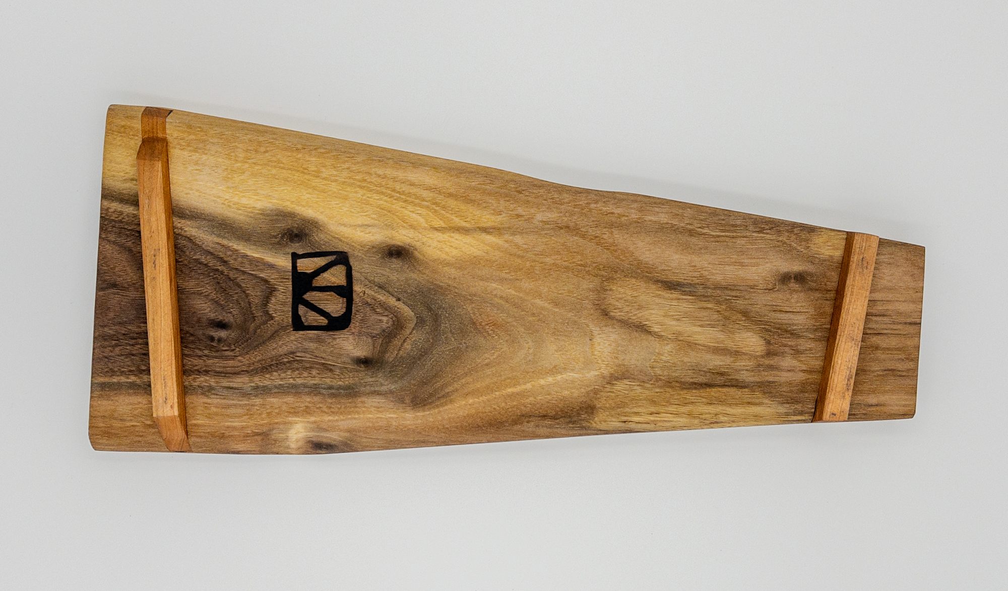 Walnut sushi board with handmade walnut chopsticks and two soy sauce bowls.